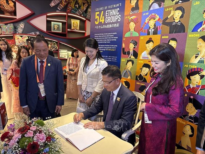 ឧបនាយករដ្ឋមន្ត្រី Le Thanh Long ចុះហត្ថលេខាលើសៀវភៅភ្ញៀវនៅឯពិព័រណ៍វៀតណាម។ រូបថត៖ Pham Tuan/VNA អ្នកឆ្លើយឆ្លងព័ត៌មានជប៉ុន |