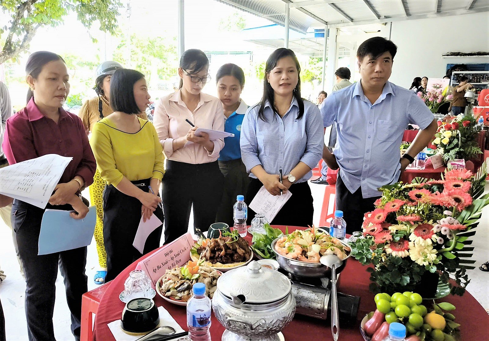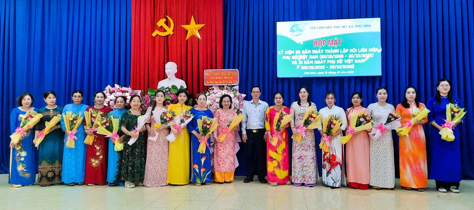 លេខាបក្ស ប្រធានក្រុមប្រឹក្សាប្រជាជនឃុំ Phu Hoa លោក Thai Minh Hien អញ្ជើញជូន កម្រងផ្កាអបអរសាទរកម្មាភិបាលស្ត្រី មន្ត្រីរាជការ បុគ្គលិកសាធារណៈ និងកម្មករ។