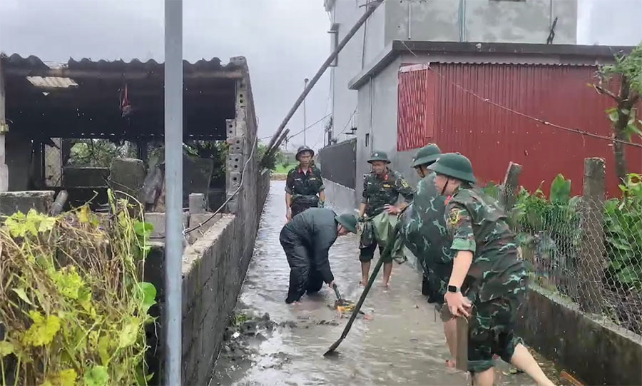 នៅឃុំ Quy Nhat ខេត្ត Ninh Binh ខ្យល់ព្យុះបានបោកបក់ដំបូលផ្ទះជាច្រើនខ្នង ដើមឈើបានរាយប៉ាយពាសពេញផ្លូវ ផ្ទះជាច្រើនខ្នងត្រូវបានបក់បោក និងដួលរលំទាំងស្រុង។ ក្នុងស្ថានភាពនោះ បញ្ជាការដ្ឋាន កងរាជអាវុធហត្ថ ខេត្ត បានចល័តនាយទាហាន និងពលទាហានរាប់ពាន់នាក់ទៅកាន់តំបន់ងាយរងគ្រោះ ដើម្បីជួយសង្គ្រោះប្រជាពលរដ្ឋបានទាន់ពេលវេលា។ ខណៈភ្លៀងនៅតែធ្លាក់ខ្លាំង មន្ត្រី និងយោធិននៃបញ្ជាការដ្ឋានកងរាជអាវុធហត្ថខេត្តរាប់រយនាក់បានក្លាហានជំនន់ទឹកភ្លៀង សម្អាតផ្ទះសម្បែងដែលដំបូលបាក់រលំទាំងស្រុង ហើយទន្ទឹមនឹងនោះ បានសម្របសម្រួលជាបន្ទាន់ជាមួយមូលដ្ឋាន ដើម្បីកាត់ដើមឈើ លុបលូ លុបដីបាក់ ធានាចរាចរណ៍បានរលូន សម្អាតផ្លូវដែលស្ទះដោយដើមឈើរលំ និងធានាចរាចរណ៍បានរលូន។