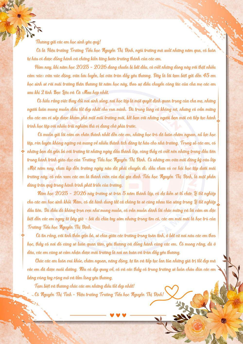 ការសួរសុខទុក្ខពីនាយកសាលាបឋមសិក្សា Nguyen Thi Dinh ដល់សិស្សានុសិស្សដែលត្រូវផ្ទេរសាលាបន្ទាប់ពីខេត្តទាំងពីរបញ្ចូលគ្នា គឺជាសារដែលពោរពេញដោយក្តីស្រលាញ់ និងការលើកទឹកចិត្ត។