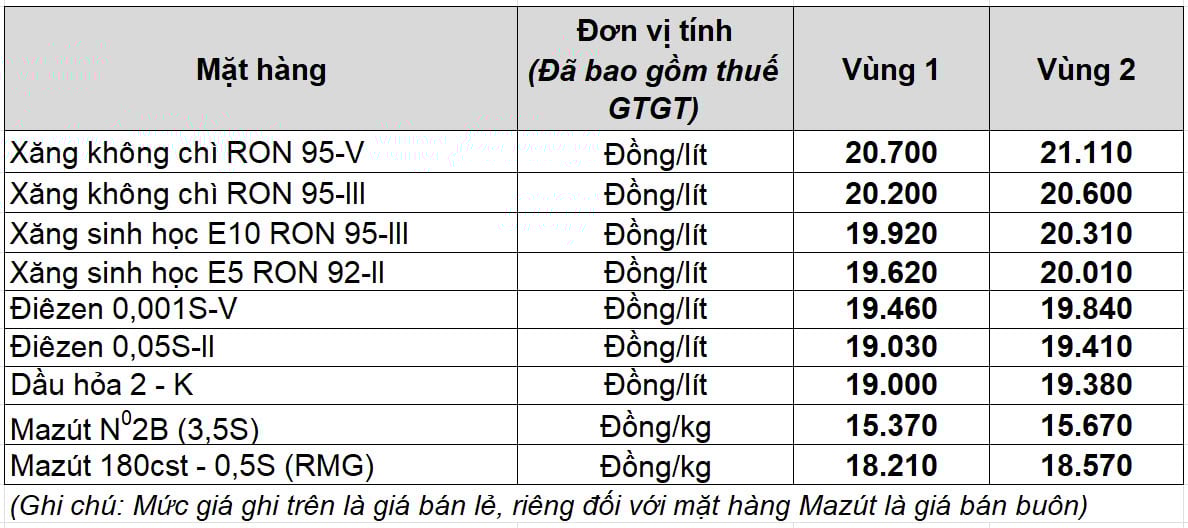 សម្រាប់តំបន់ដែលនៅឆ្ងាយពីកំពង់ផែ ឆ្ងាយពីឃ្លាំងធំៗ ឆ្ងាយពីកន្លែងផលិតប្រេងឥន្ធនៈ ដូចមានចែងក្នុងប្រការ ២៧ មាត្រា ១ ក្រឹត្យលេខ ៩៥/២០២១/ND-CP ចុះថ្ងៃទី 1 ខែវិច្ឆិកា ឆ្នាំ 2021 របស់ រដ្ឋាភិបាល (ក្រុមហ៊ុន Petrolimex ហៅថា "តំបន់ 2"); អគ្គនាយកក្រុមហ៊ុន Petrolimex អនុញ្ញាតឱ្យនាយកក្រុមហ៊ុនប្រេងសមាជិក Petrolimex សម្រេចដោយផ្ទាល់លើតម្លៃលក់ជាក់ស្តែងនៅទីតាំងអាជីវកម្ម ប៉ុន្តែមិនត្រូវលើសពីកម្រិតតម្លៃនៃតំបន់ 2 ដែលបានរៀបរាប់ខាងលើ។