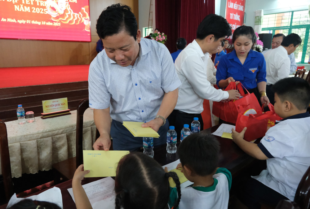 កម្មវិធីនេះបានប្រគល់អំណោយចំនួន 240 ដែលក្នុងម្នាក់ៗមានតម្លៃ 650.000 ដុង រួមទាំងប្រាក់ចំនួន 500.000 ដុង នំសែនព្រះខែ និងគោម។ ក្នុងនោះ អនុប្រធានគណៈកម្មាធិការបក្សខេត្ត លោក Pham Hung Thai ប្រមូលអំណោយចំនួន ៧៥ អំណោយ អនុប្រធានគណៈកម្មាធិការប្រជាជនខេត្ត លោក Pham Tan Hoa ប្រមូលអំណោយចំនួន ៩០។ អំណោយដ៏មានអត្ថន័យទាំងនេះបានរួមចំណែកនាំមកនូវភាពសប្បាយរីករាយ និងលើកទឹកចិត្តដល់ស្មារតីកុមារក្នុងឱកាសពិធីបុណ្យពាក់កណ្តាលរដូវស្លឹកឈើជ្រុះនៅឃុំ An Ninh។