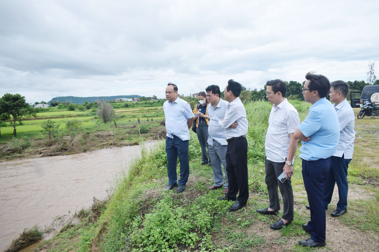 អនុប្រធានគណៈកម្មាធិការប្រជាជនខេត្ត លោក Duong Mah Tiep (ឆ្វេងស្តាំ) ចុះពិនិត្យច្រាំងខាងកើតនៃទន្លេ Ia Sol ឃុំ Phu Thien។