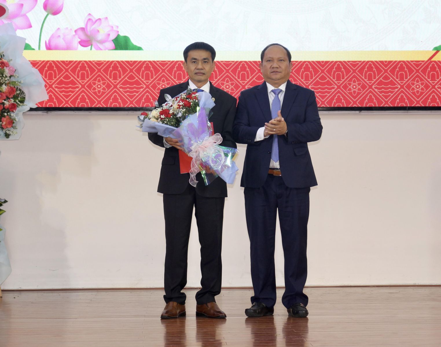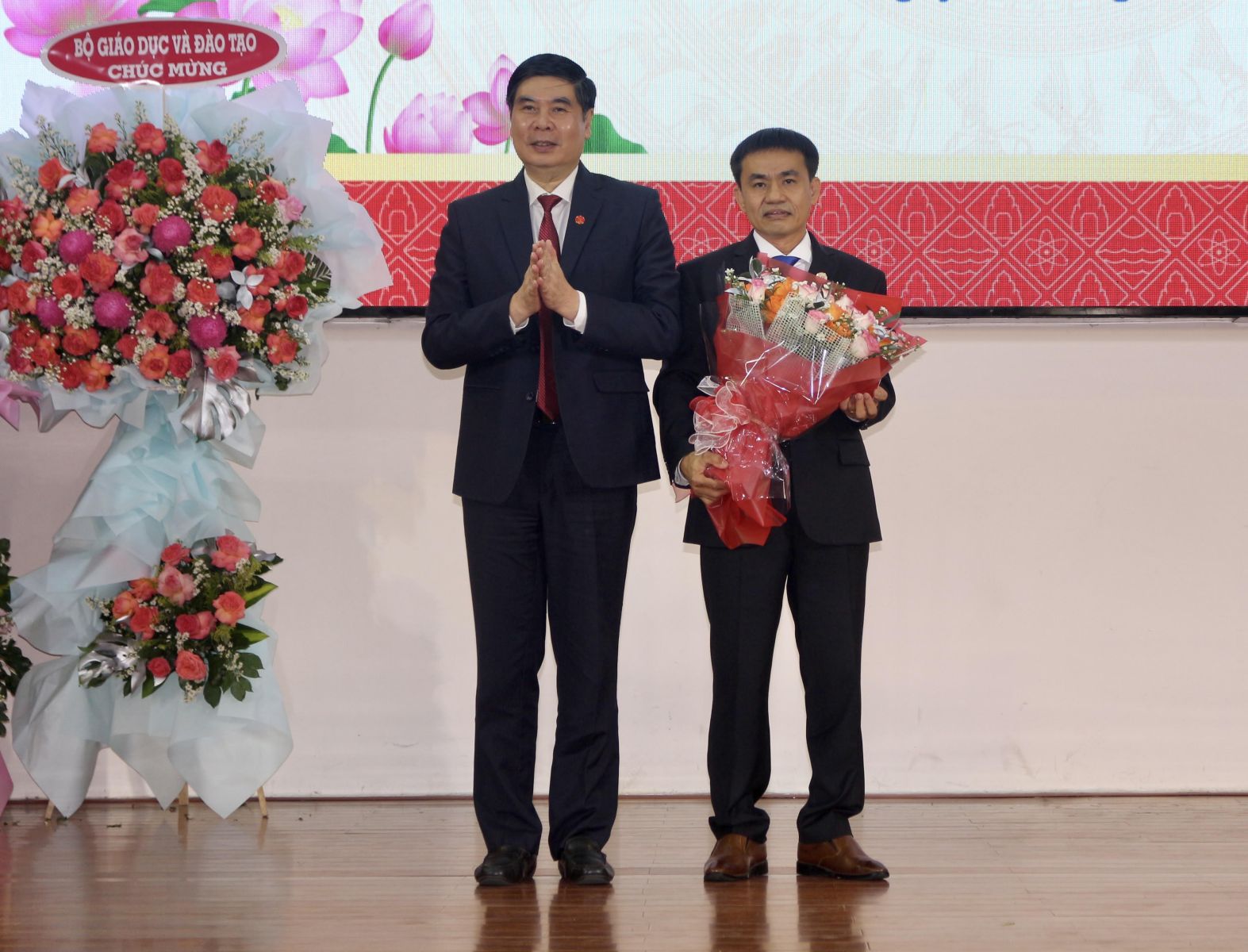 អនុប្រធានអចិន្ត្រៃយ៍គណៈកម្មាធិការបក្សខេត្ត ប្រធានក្រុមប្រឹក្សាប្រជាជនខេត្ត (គម្របខាងស្តាំ) ជូនផ្កាអបអរសាទរសាកលវិទ្យាធិការនៃសាកលវិទ្យាល័យ Quy Nhon