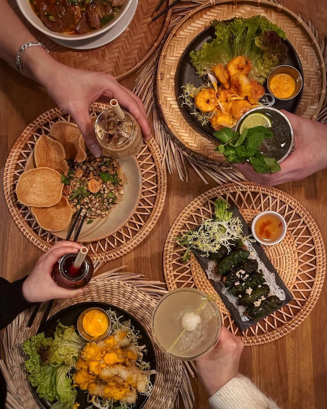 អាហារថ្ងៃត្រង់អាចចាប់ផ្តើមអាហាររបស់ពួកគេជាមួយនឹងនំបញ្ចុកសាច់គោដែលពោរពេញទៅដោយសាឡាត់ស្រស់ មីទន់ៗ សណ្តែកបណ្តុះបំពង សាច់គោអាំងក្រអូប បម្រើជាមួយទឹកត្រីផ្អែម និងជូរ។ បើអ្នកចូលចិត្តគ្រឿងសមុទ្រអាចជ្រើសរើសបង្កងអាំងក្រអូបឈ្ងុយ។