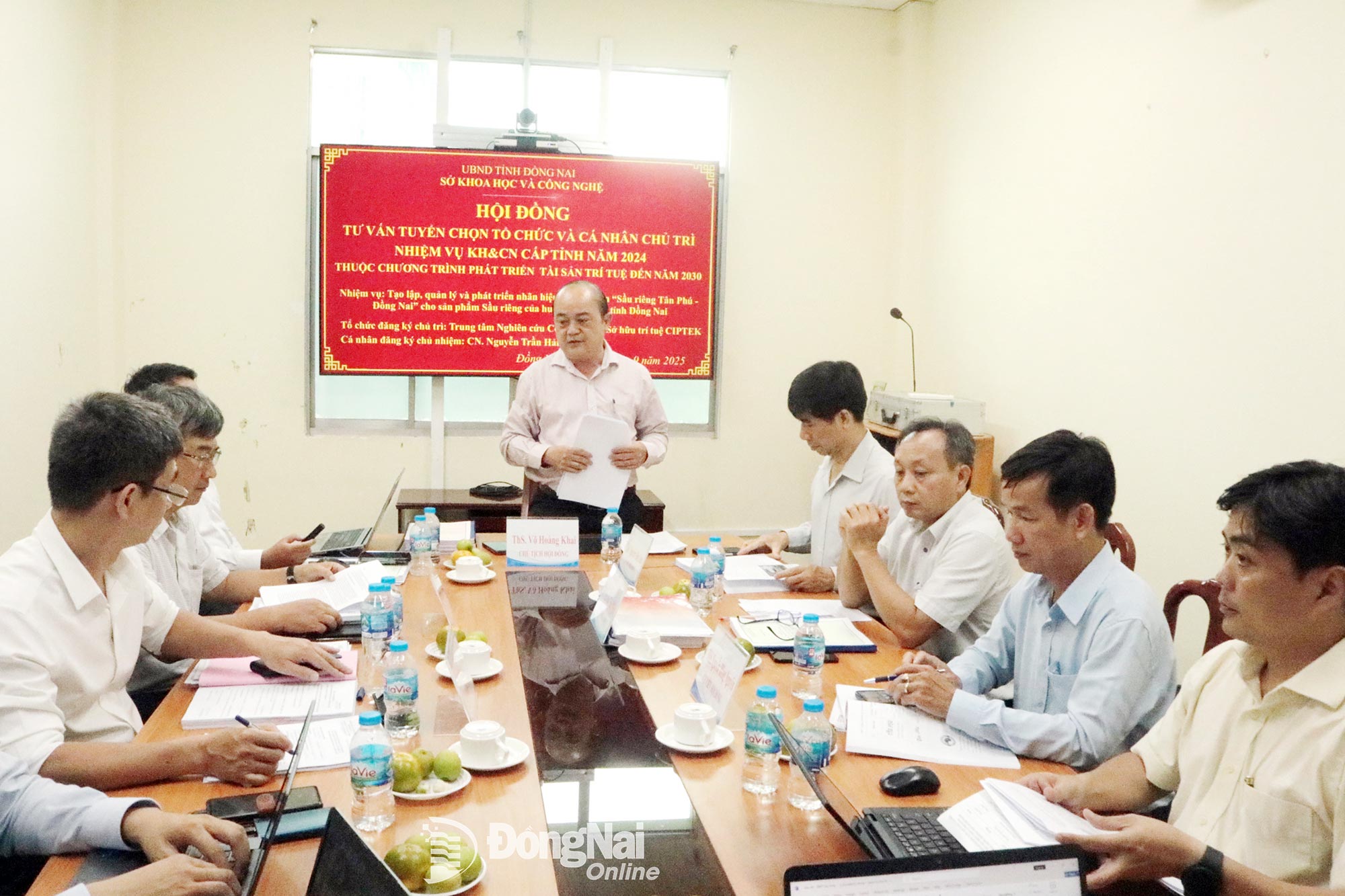 អនុប្រធានមន្ទីរវិទ្យាសាស្ត្រ និងបច្ចេកវិទ្យាខេត្ត Dong Nai លោក Vo Hoang Khai ថ្លែងមតិនៅក្រុមប្រឹក្សាជ្រើសរើសអង្គការ និងបុគ្គលដើម្បីបំពេញភារកិច្ចបង្កើត គ្រប់គ្រង និងអភិវឌ្ឍសញ្ញាប័ត្រ “Tan Phu - Dong Nai durian”។ រូបថត៖ ផាម សែន |