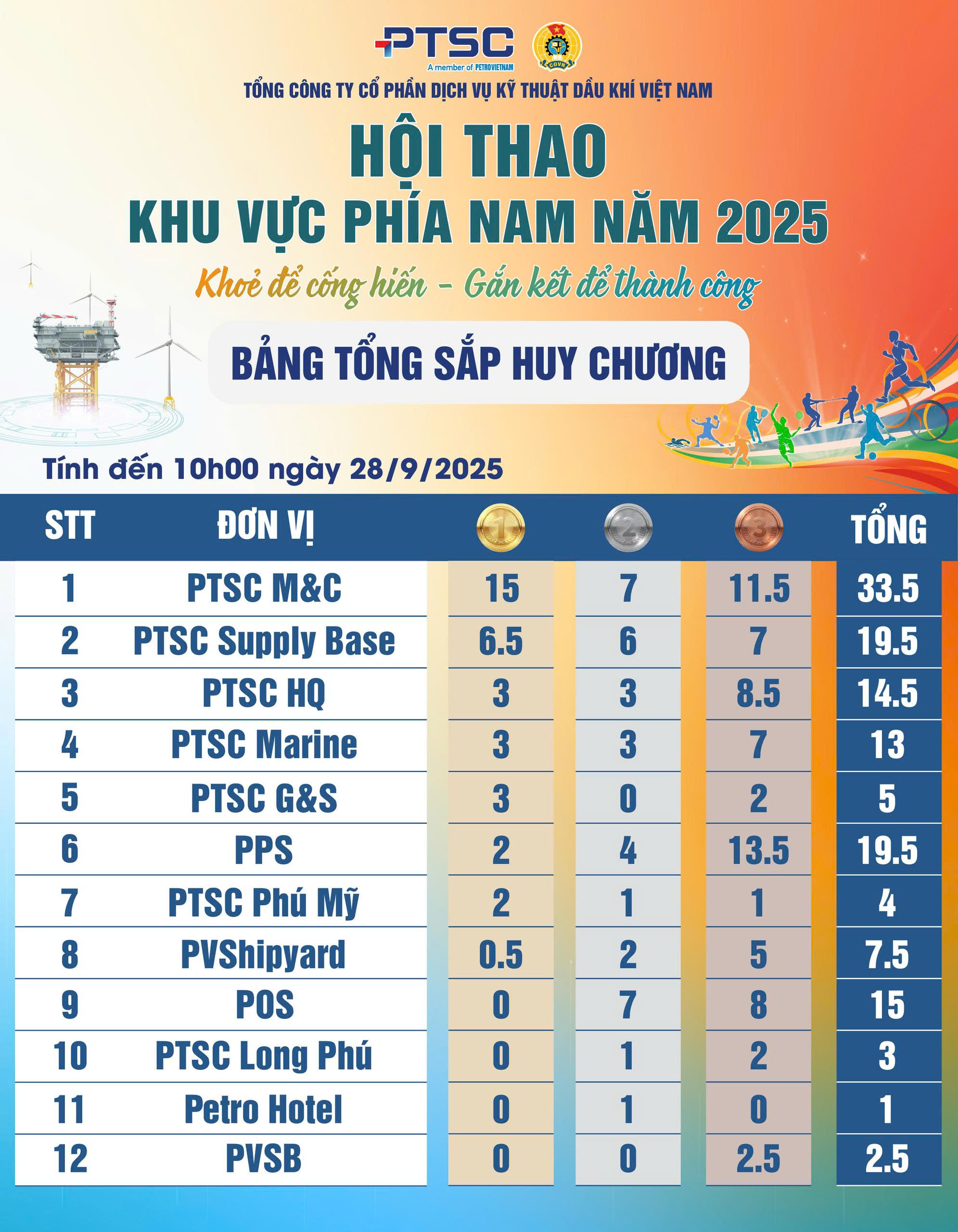 នៅក្នុងលទ្ធផលចុងក្រោយ ក្រុម PTSC M&C បាននាំមុខគេក្នុងចំណាត់ថ្នាក់ទាំងមូលបានយ៉ាងល្អ ដោយទទួលបានមេដាយមាសចំនួន 15 មេដាយប្រាក់ចំនួន 7 និងមេដាយសំរឹទ្ធចំនួន 11.5 ដែលបញ្ជាក់ពីភាពរឹងមាំដ៏ទូលំទូលាយ និងការវិនិយោគដ៏ធ្ងន់ធ្ងរនៅក្នុងចលនាកីឡា។ ចំណាត់ថ្នាក់លេខ 2 គឺក្រុម PTSC Supply Base ដែលមានមេដាយមាស 6.5 មេដាយប្រាក់ 6 និងមេដាយសំរឹទ្ធ 7 តាមពីក្រោយដោយក្រុម PTSC HQ ជាមួយនឹងសមិទ្ធិផលលើកទឹកចិត្ត 14.5 មេដាយគ្រប់ប្រភេទ។