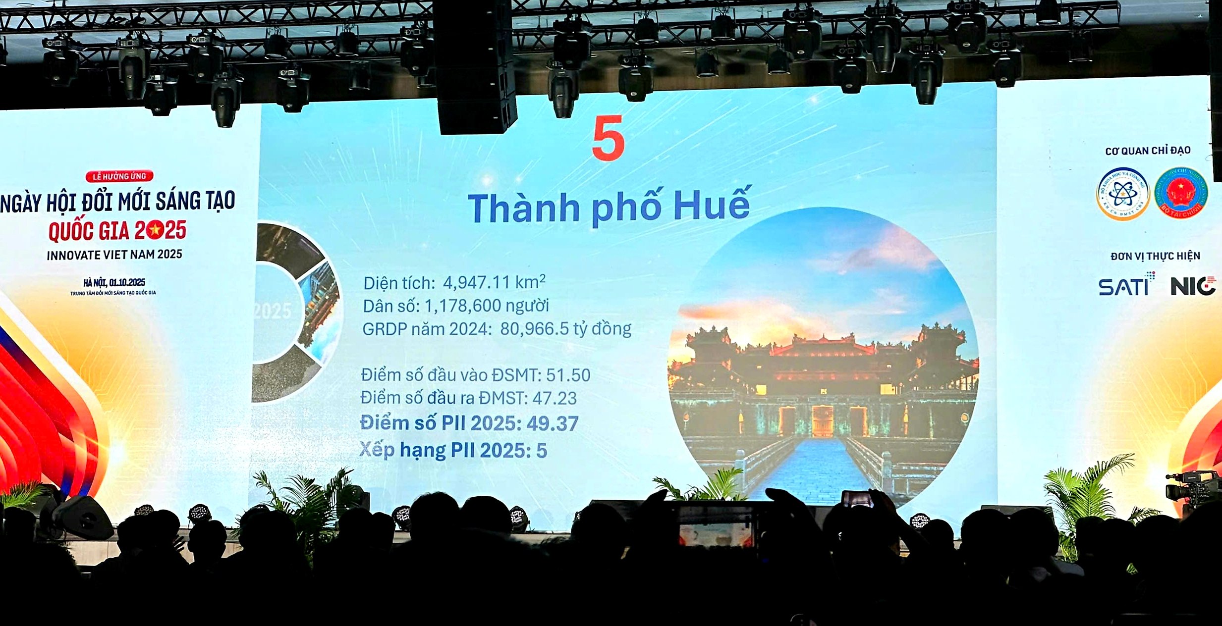 ក្នុងពិធីឆ្លើយតបនឹងទិវានវានុវត្តន៍ជាតិឆ្នាំ 2025 គណៈកម្មាធិការរៀបចំបានប្រកាសសន្ទស្សន៍នវានុវត្តន៍ក្នុងស្រុក (PII) ឆ្នាំ 2025។ ជាពិសេស 5 មូលដ្ឋានគឺ ហាណូយ ហូជីមិញ ក្វាងនិញ ហាយផុង និងទីក្រុង Hue បានជាប់ចំណាត់ថ្នាក់កំពូលទាំង 5 PII Index ក្នុងឆ្នាំ 2025។ ទីក្រុង Hue ទទួលបានពិន្ទុ 11។ ពិន្ទុលទ្ធផលច្នៃប្រឌិត 47.23; និង PII 2025 ពិន្ទុ 49.37 ជាប់ចំណាត់ថ្នាក់ទី 5 ទូទាំងប្រទេសក្នុងសន្ទស្សន៍ PII ក្នុងឆ្នាំ 2025 ។