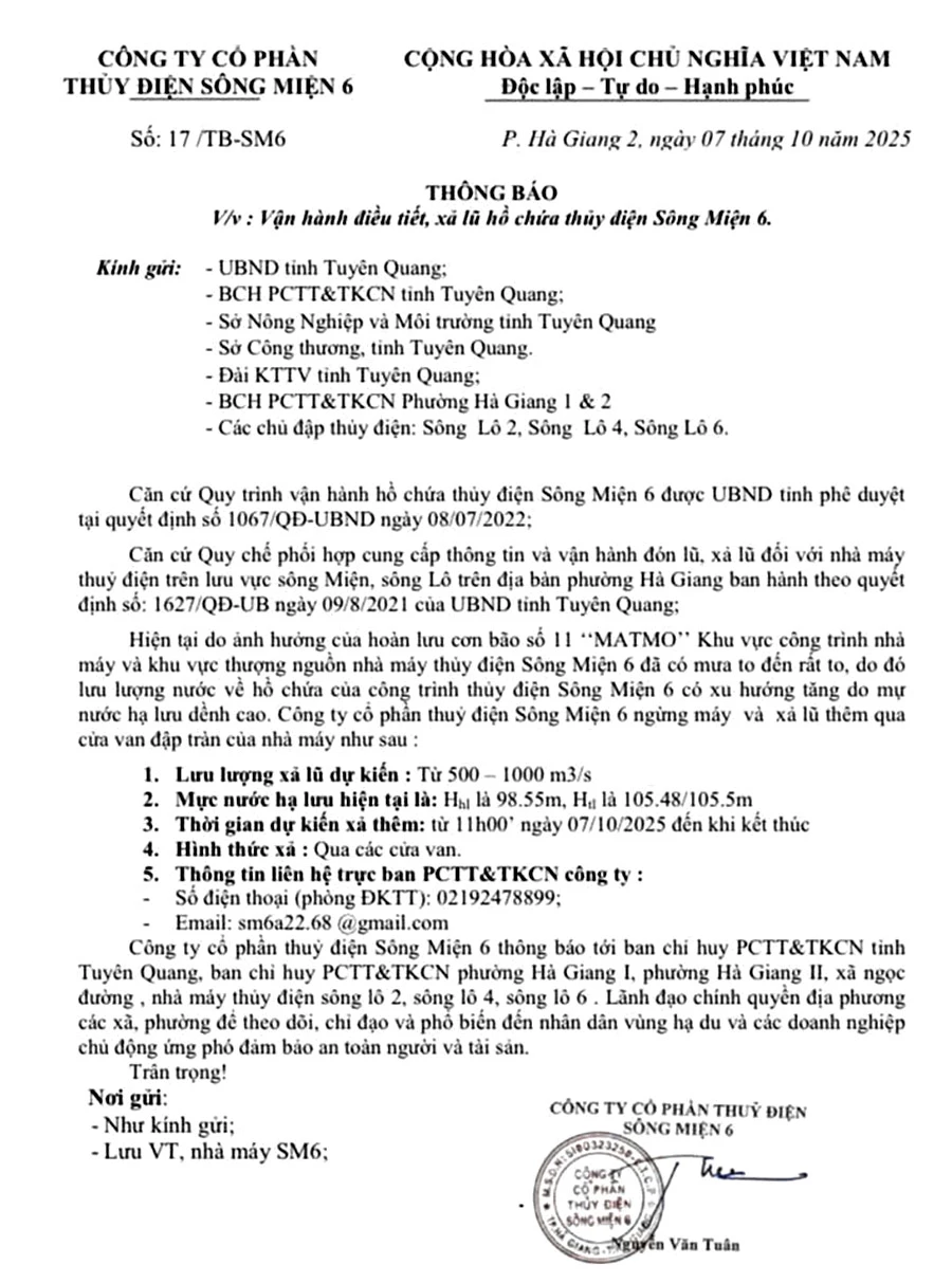 ដោយសារឥទ្ធិពលនៃចរន្តខ្យល់ព្យុះលេខ១១ (MATMO) បង្កឲ្យមានភ្លៀងធ្លាក់ខ្លាំង ក្រុមហ៊ុនភាគហ៊ុនវារីអគ្គិសនី Song Mien 6 បានប្រកាសប្រតិបត្តិការ បទបញ្ជា និងការបញ្ចេញទឹកជន់លិចអាង ដើម្បីធានាសុវត្ថិភាពនៃគម្រោង និងខ្សែទឹកខាងក្រោមដូចខាងក្រោម៖
