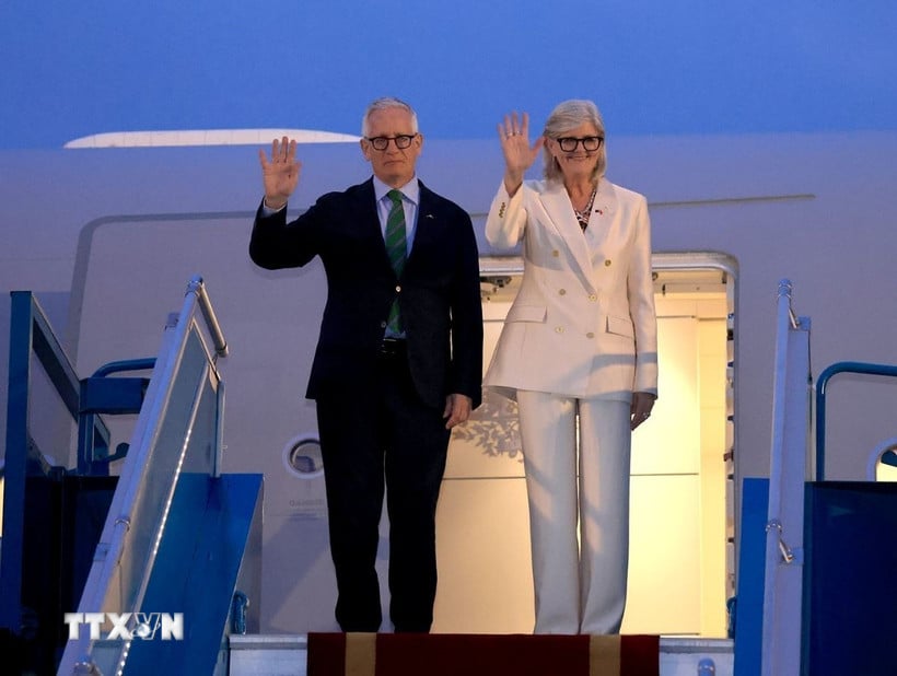 ពិធីទទួលស្វាគមន៍អគ្គទេសាភិបាលអូស្ត្រាលី លោក Sam Mostyn និងភរិយា នៅអាកាសយានដ្ឋានអន្តរជាតិ Noi Bai។ (រូបថត៖ Tuan Anh/VNA) |