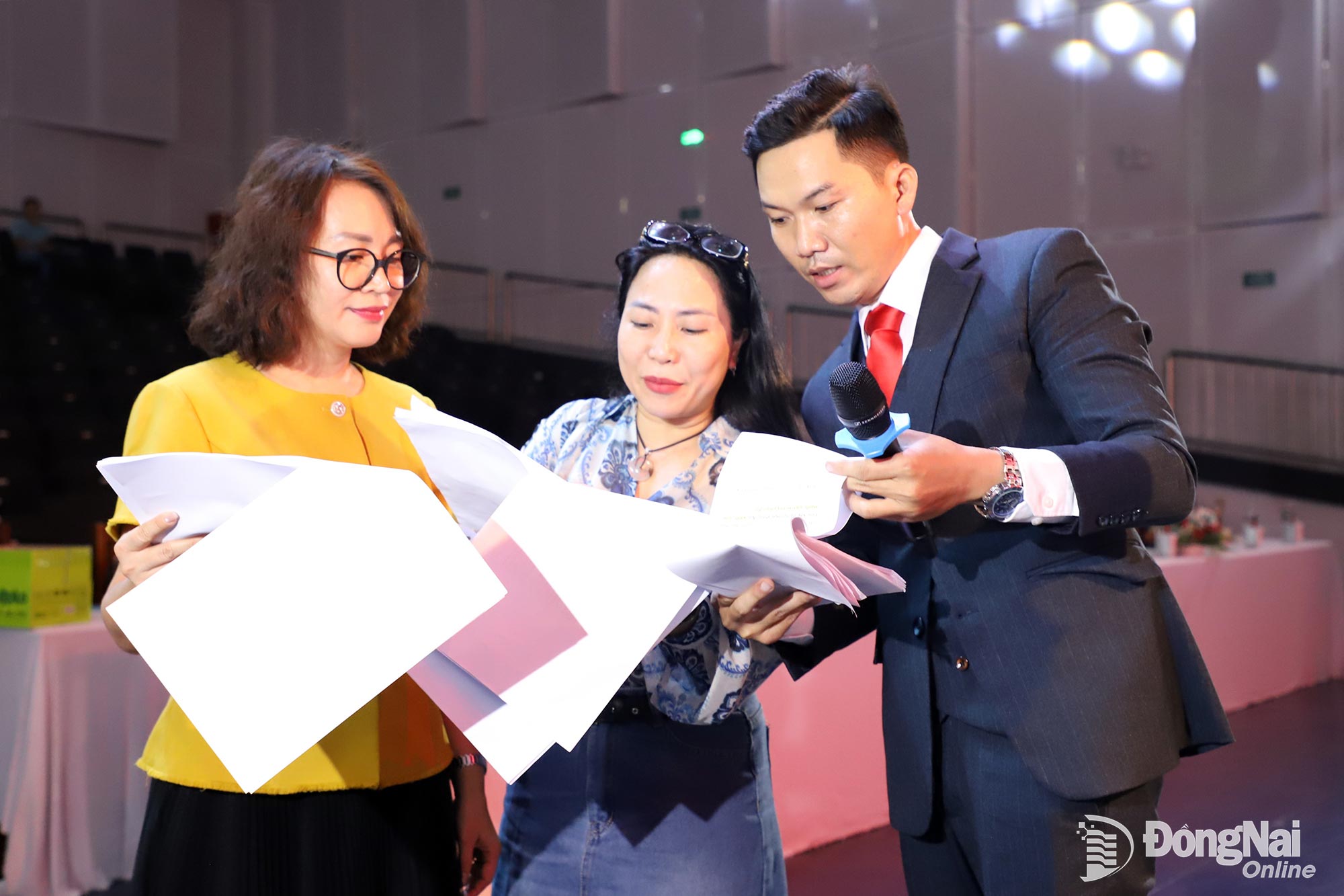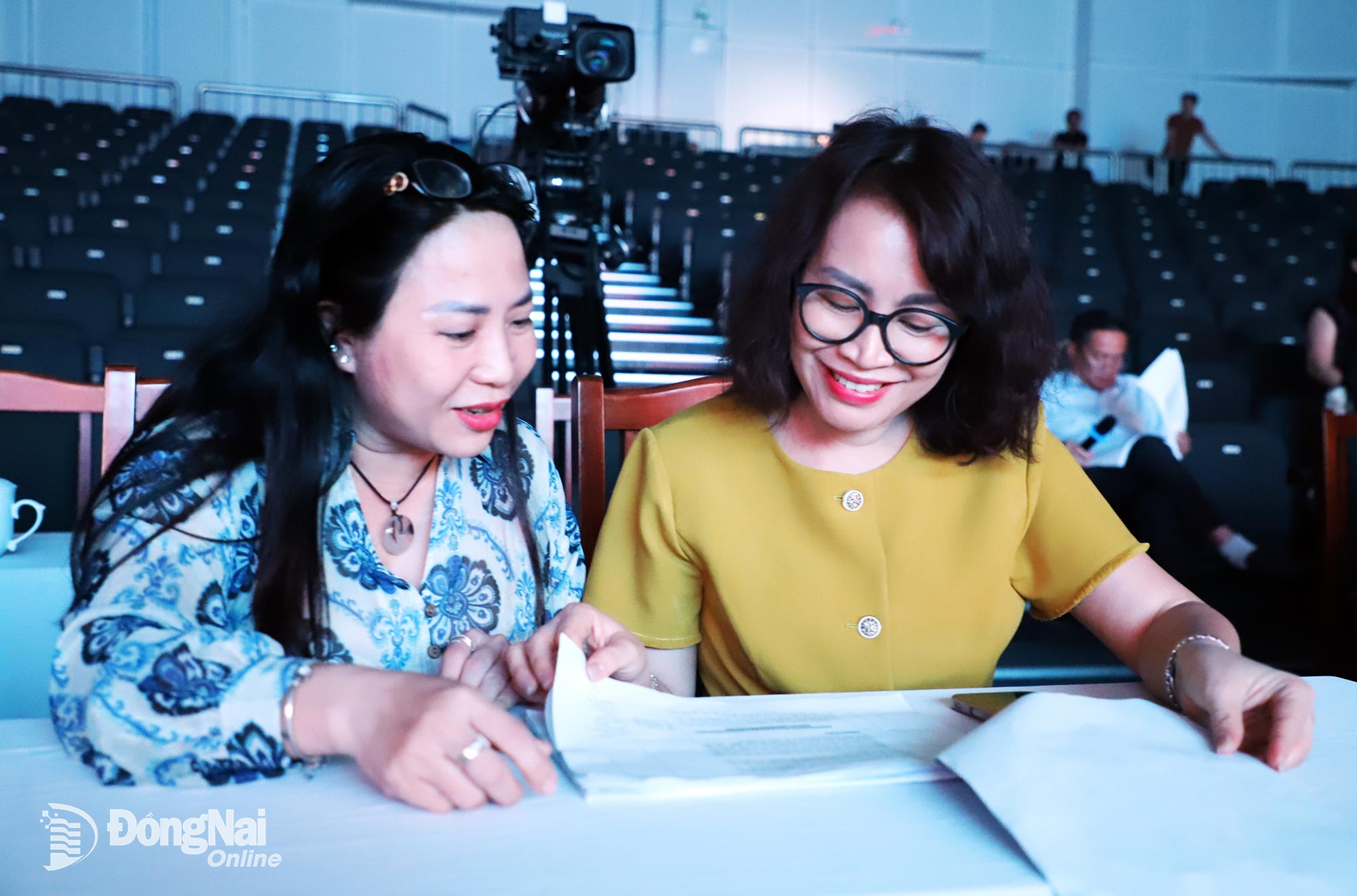 សមាជិកគណៈកម្មាធិការបក្សខេត្ត និពន្ធនាយកកាសែត Dong Nai វិទ្យុ និងទូរទស្សន៍ Nguyen Thi Minh Nham ពិនិត្យអក្សរនៅការហាត់សមរបស់កម្មវិធី។ រូបភាព៖ ថាវ នី |