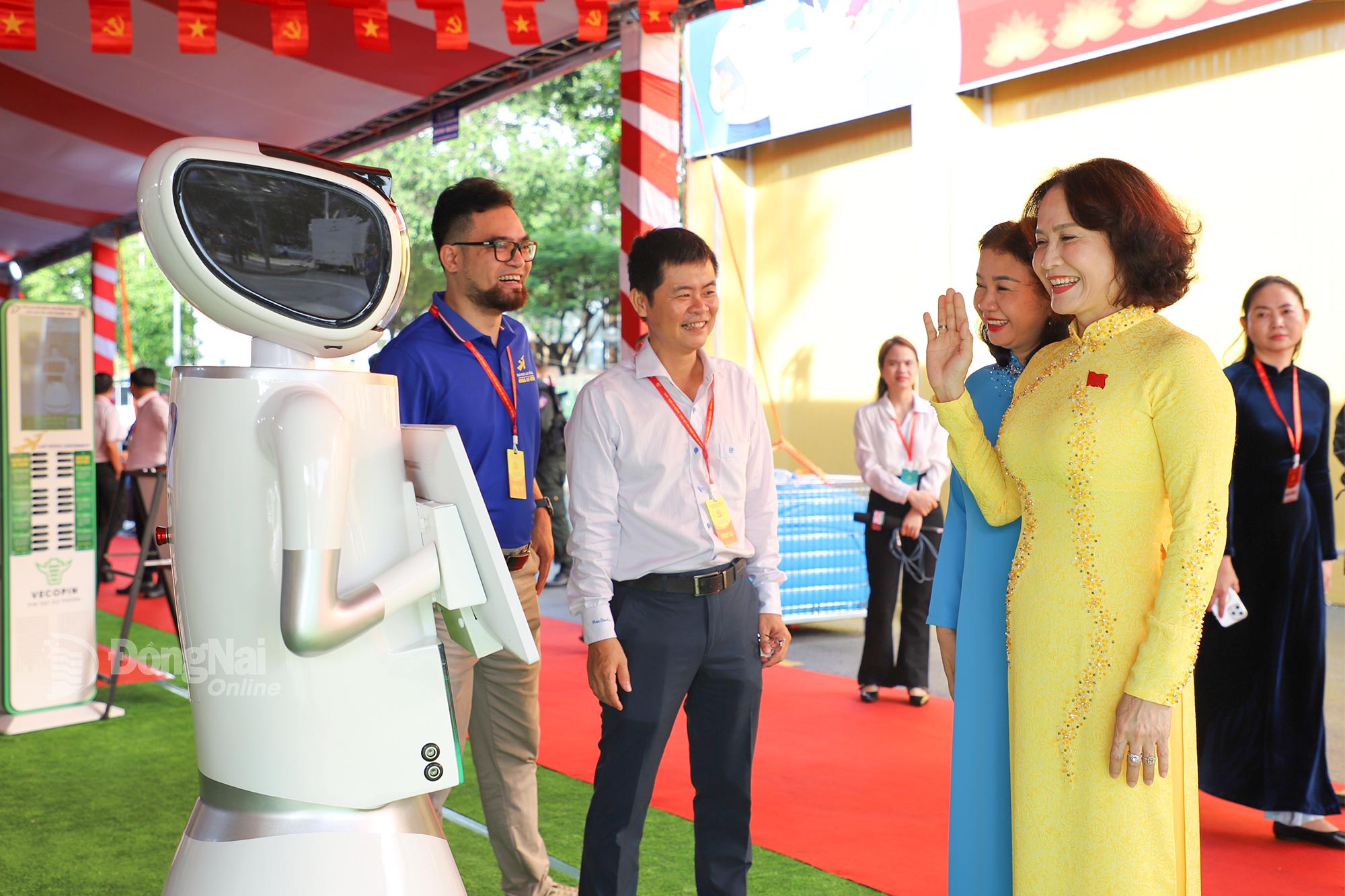 ការតាំងពិព័រណ៍របស់សាកលវិទ្យាល័យ Lac Hong បង្ហាញផលិតផលដែលត្រូវបានផ្ទេរទៅឱ្យអាជីវកម្ម គំរូមនុស្សយន្តដែលអនុវត្តមុខងាររបស់មនុស្ស និងទំនាក់ទំនងជាមួយប្រតិភូដែលចូលរួមក្នុងសមាជ។