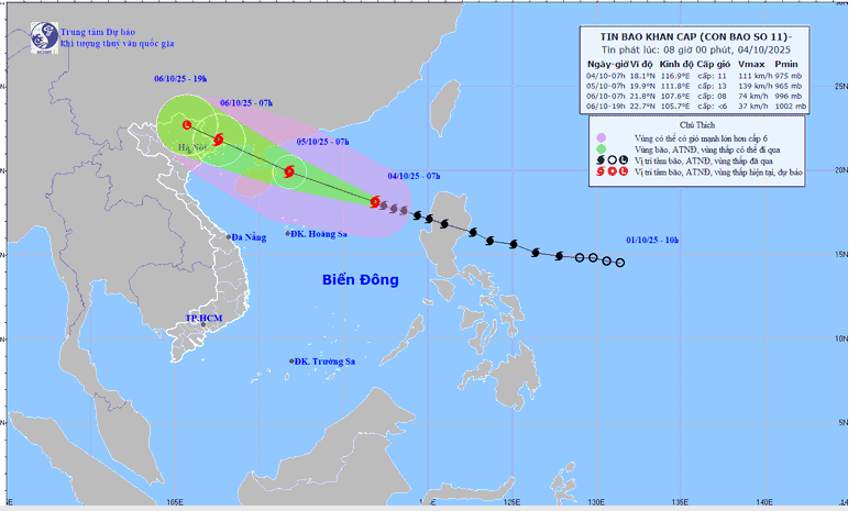 យោងតាមការព្យាករណ៍របស់មជ្ឈមណ្ឌលជាតិសម្រាប់ព្យាករណ៍ធនធានជលសាស្ត្រ ព្យុះលេខ ១១ នឹងបន្តពង្រឹងដល់កម្រិត ១២-១៣ បោកបក់ដល់កម្រិត ១៥-១៦ ផ្លាស់ទីយ៉ាងលឿនឆ្ពោះទៅឧបទ្វីប Lei Chau និងឈូងសមុទ្រតុងកឹង។ ចាប់ពីថ្ងៃទី 5-7 ខែតុលា ឆ្នាំ 2025 ខ្យល់ព្យុះនឹងប៉ះពាល់ផ្ទាល់ដល់ឈូងសមុទ្រតុងកឹង ឆ្នេរសមុទ្រ និងដីគោកនៃប្រទេសយើង ដោយបន្តបណ្តាលឱ្យមានភ្លៀងធ្លាក់ខ្លាំងនៅតំបន់ភាគខាងជើង និងខេត្ត Thanh Hoa ខេត្ត Nghe An ។