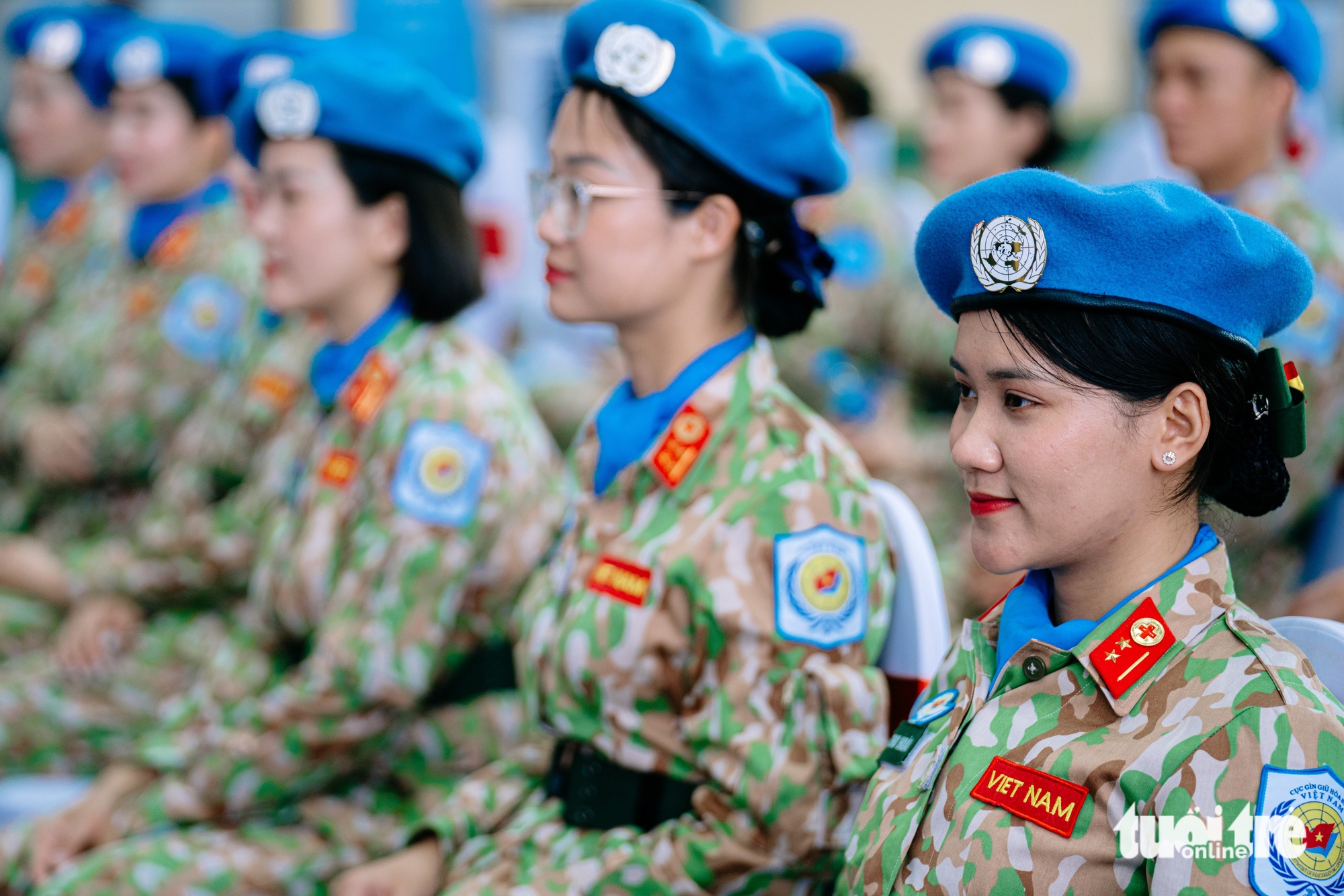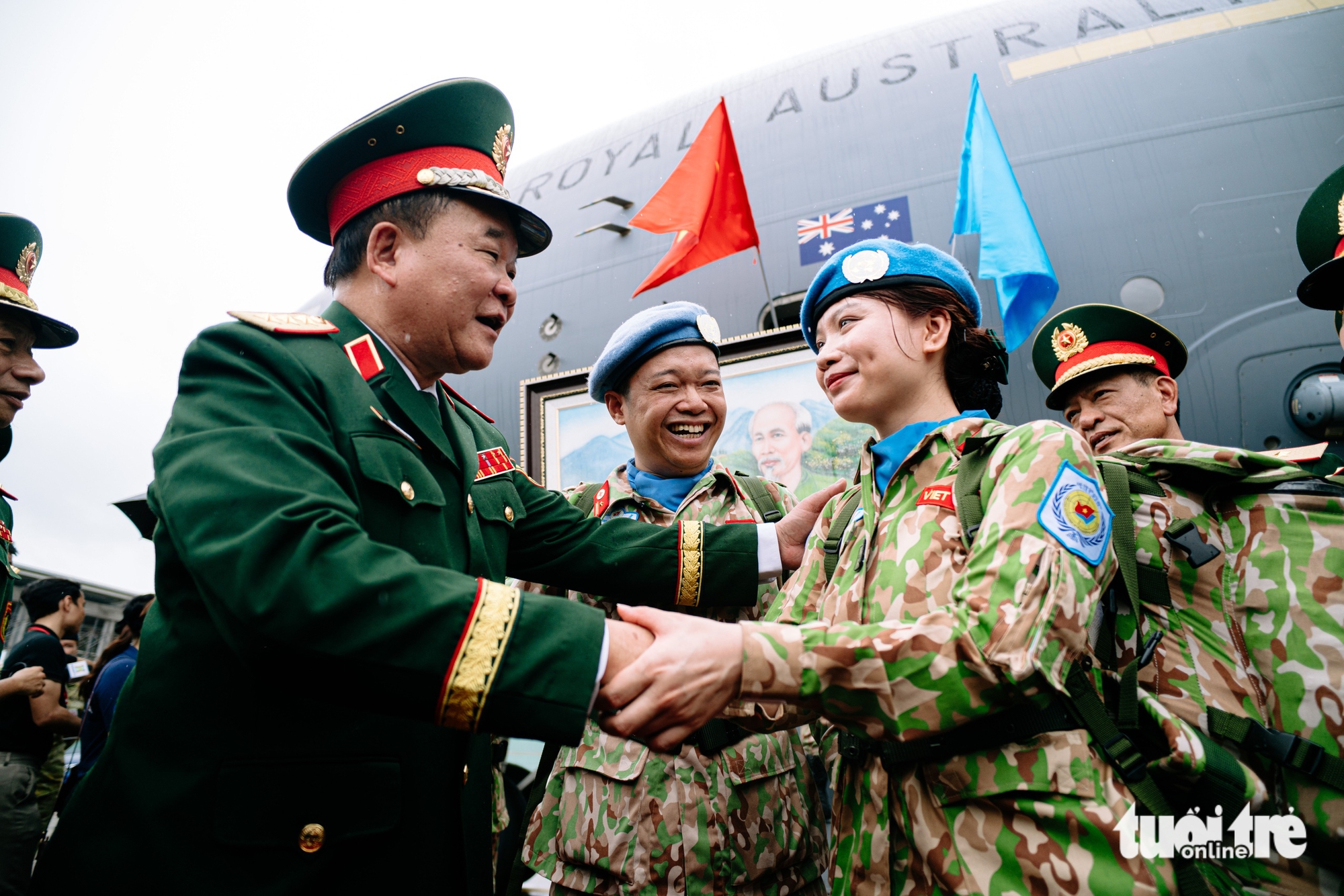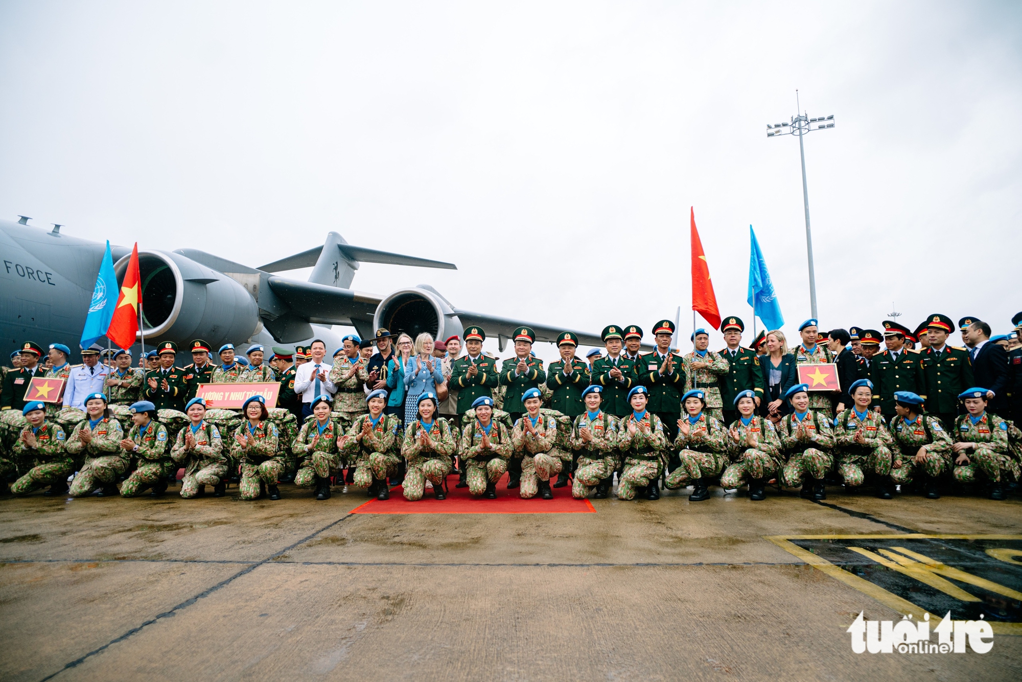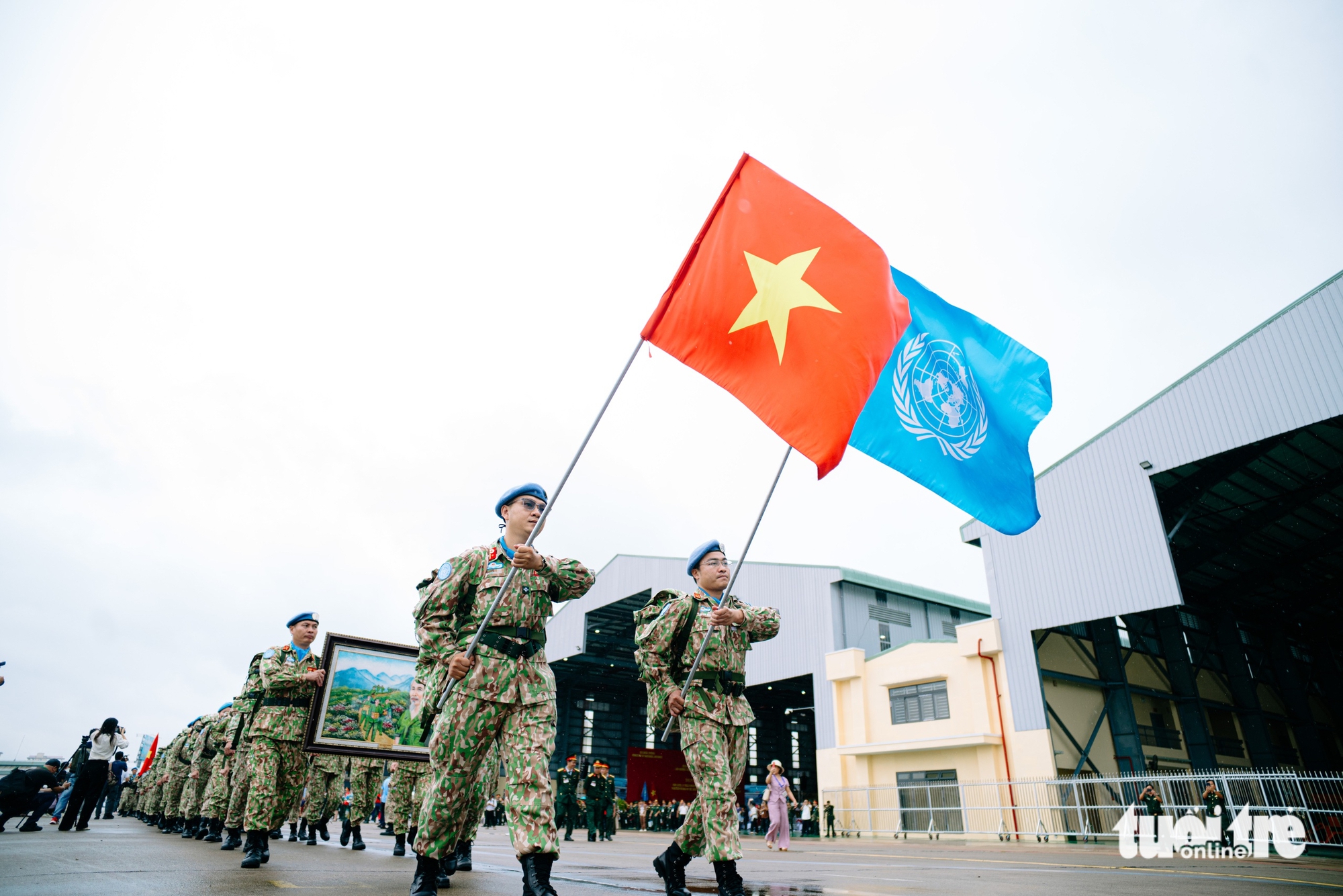 Blue Berets កាន់ទង់ជាតិខ្ពស់ និងទង់អង្គការសហប្រជាជាតិ នៅពេលពួកគេធ្វើដំណើរទៅកាន់យន្តហោះដែលដឹកកងកម្លាំងរក្សាសន្តិភាពទៅកាន់បេសកកម្មពីរនៅស៊ូដង់ខាងត្បូង និងអាប៊ីយ - រូបថត៖ THANH HIEP