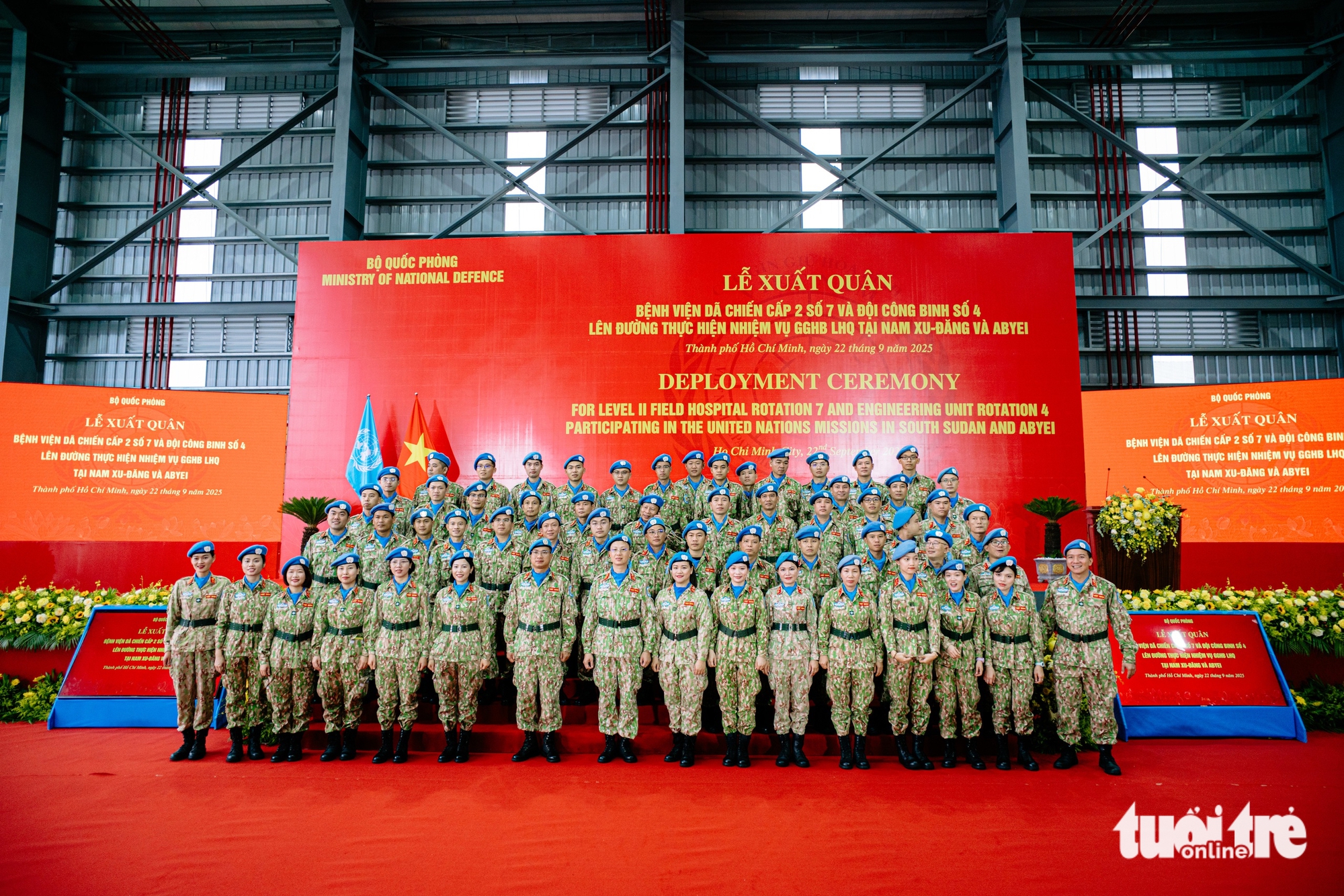 ពិធីចេញដំណើរបានធ្វើឡើងដោយផ្ទាល់ និងតាមប្រព័ន្ធអនឡាញ នៅសាលនាយកដ្ឋានរក្សាសន្តិភាពវៀតណាម និងនៅអាកាសយានដ្ឋាន Tan Son Nhat (HCMC) ក្រោមអធិបតីភាព ឧត្តមសេនីយឯក Hoang Xuan Chien សមាជិកគណៈកម្មាធិការមជ្ឈិមបក្ស អនុរដ្ឋមន្ត្រី ក្រសួងការពារជាតិ ប្រធានគណៈកម្មាធិការដឹកនាំក្រសួងការពារជាតិ ស្តីពីការចូលរួមក្នុងប្រតិបត្តិការរក្សាសន្តិភាពអង្គការសហប្រជាជាតិ។