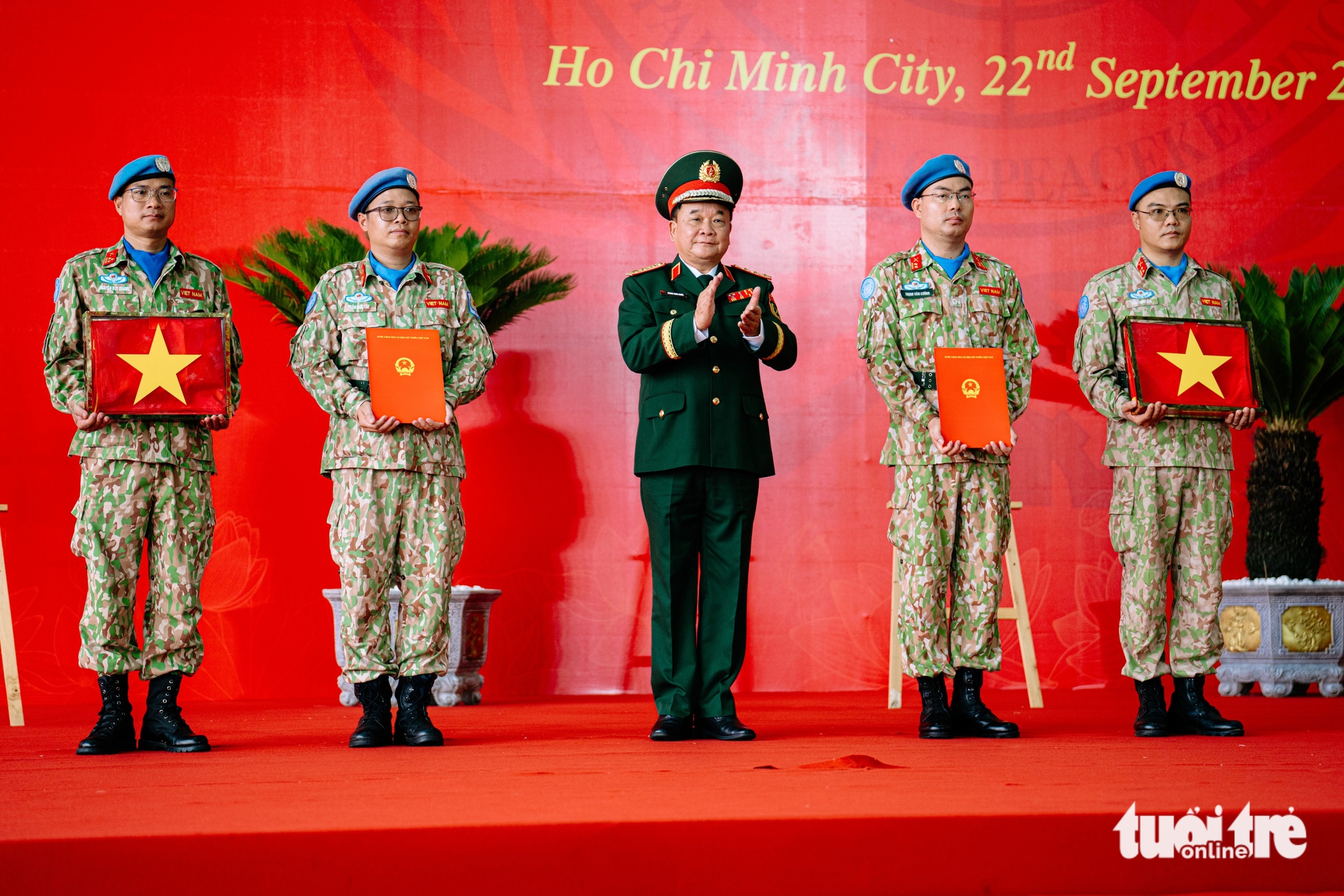 ឧត្តមសេនីយឯក Hoang Xuan Chien អនុរដ្ឋមន្ត្រីក្រសួងការពារជាតិ ប្រធានគណៈកម្មាធិការដឹកនាំក្រសួងការពារជាតិ ចូលរួមប្រតិបត្តិការ រក្សាសន្តិភាព អង្គការសហប្រជាជាតិ បានលើកទឹកចិត្តទាហានរក្សាសន្តិភាពចេញដំណើរទៅបំពេញបេសកកម្មអន្តរជាតិនៅអាកាសយានដ្ឋាន Tan Son Nhat នាព្រឹកថ្ងៃទី ២២ ខែកញ្ញា - រូបភាព៖ THANH HIEP