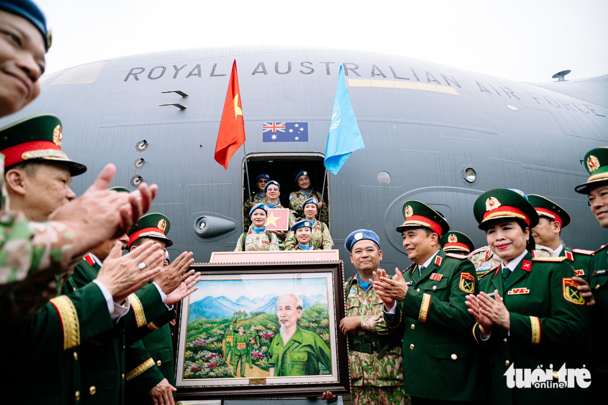 កងរក្សាសន្តិភាពអង្គការសហប្រជាជាតិ ថ្នាក់ដឹកនាំក្រសួងការពារជាតិ អង្គការអន្តរជាតិ ស្ថានទូត និងមន្ត្រីក្រសួងការពារជាតិនៃប្រទេសវៀតណាមថតរូបអនុស្សាវរីយ៍នៅមុខយន្តហោះដឹកជញ្ជូន C17 របស់កងទ័ពអាកាសអូស្ត្រាលី - រូបថត៖ THANH HIEP