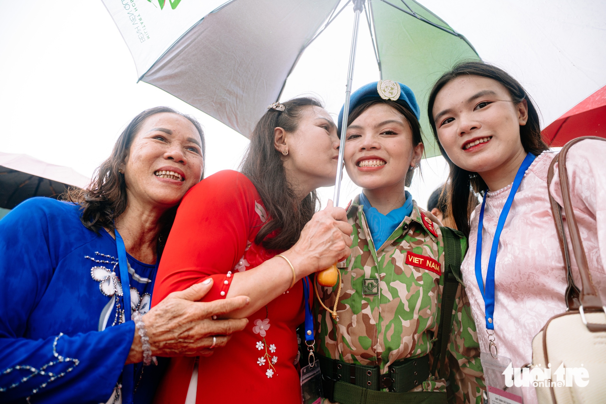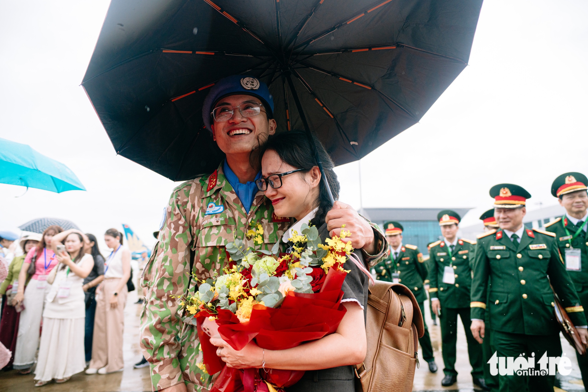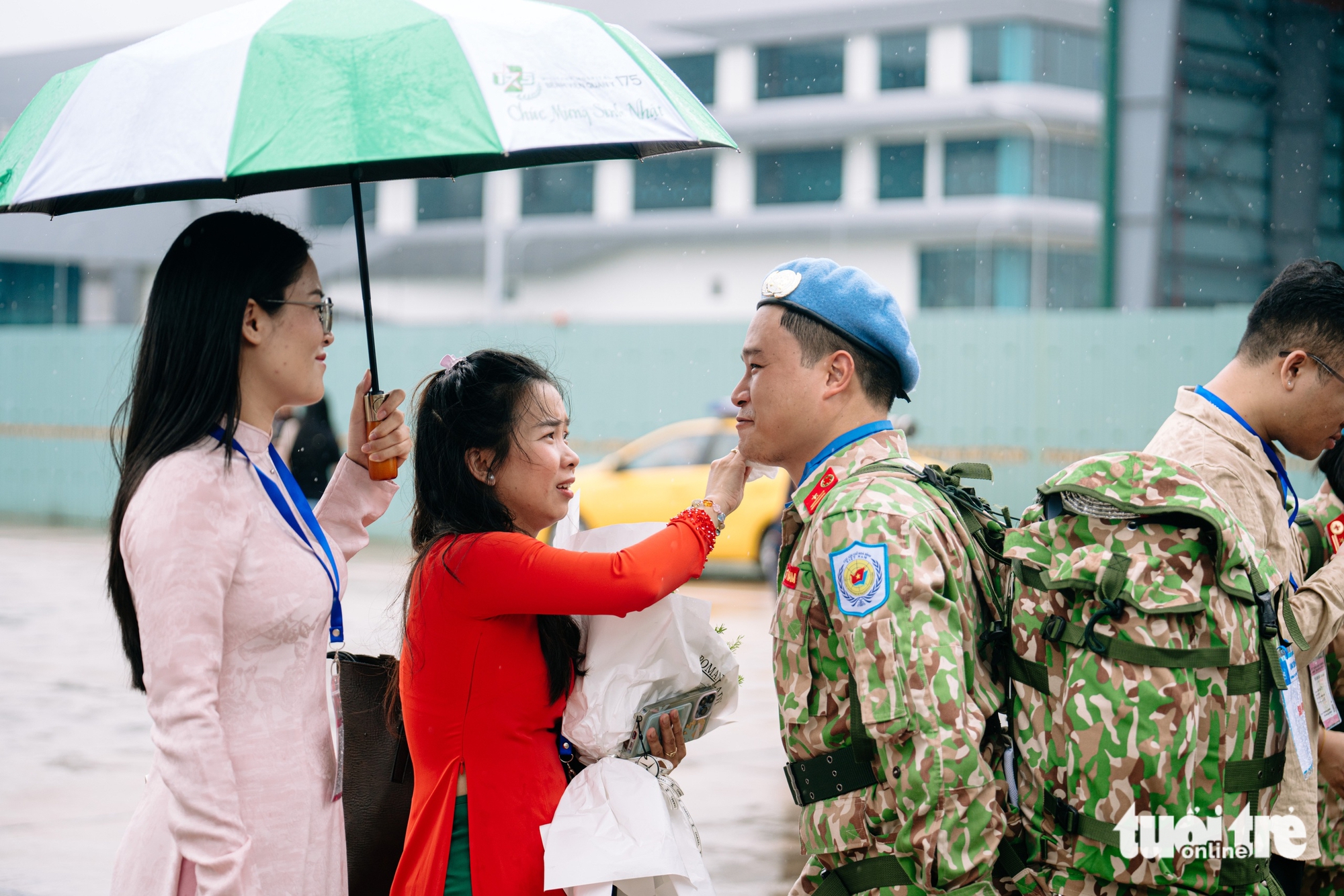 ក្នុងភ្លៀងធ្លាក់មួយរំពេច ទាហានជាច្រើនមុនពេលចាកចេញមិនអាចជួយអ្វីបានឡើយ ប៉ុន្តែត្រូវបានរំសាយដោយអារម្មណ៍នៅក្នុងដៃនៃគ្រួសារ និងមនុស្សជាទីស្រឡាញ់របស់ពួកគេ។ មុខផ្ទះគឺជាការលើកទឹកចិត្តសម្រាប់ Green Berets ឱ្យខិតខំបំពេញបេសកកម្មដ៏ពិសិដ្ឋរបស់ពួកគេសម្រាប់មាតុភូមិ - រូបថត៖ THANH HIEP