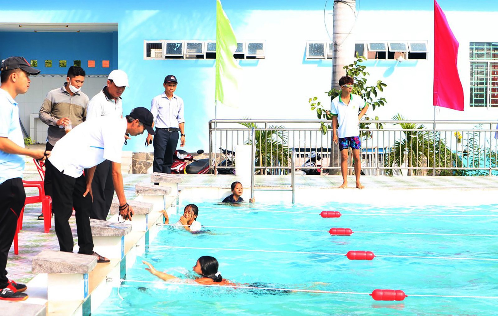 ឃុំអានចូវ រៀបចំការប្រកួតហែលទឹក ដល់សិស្សានុសិស្ស ដើម្បីអនុវត្តជំនាញហែលទឹក និងកាត់បន្ថយគ្រោះថ្នាក់លង់ទឹកលើកុមារ។ រូបថត៖ LE TRUNG HIEU