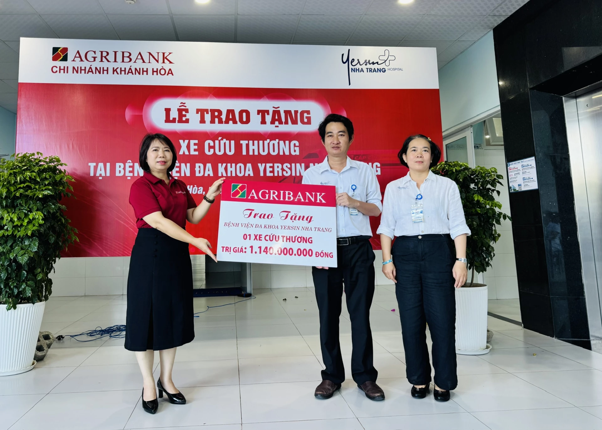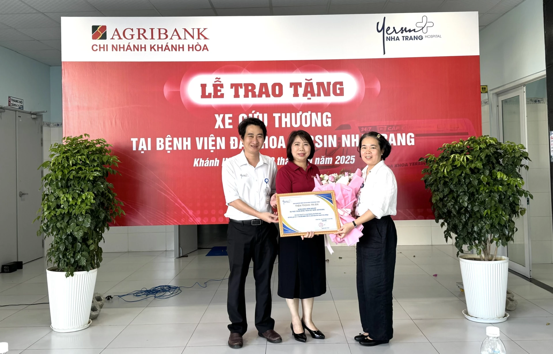 아그리뱅크 칸호아 지점 대표가 예르신 나트랑 종합병원에 구급차를 기증하는 상징적인 기념패를 전달했습니다. |