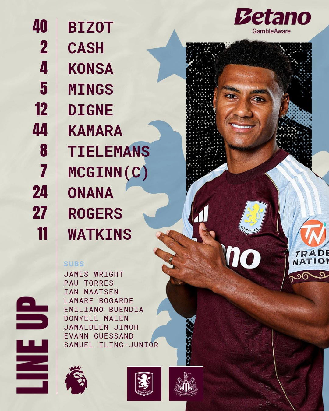 애스턴 빌라 (4-4-2): 비조트; 캐쉬, 콘사, 밍스, 디뉴; 카마라, 틸레만스; 오나나, 맥긴, 로저스; 왓킨스.