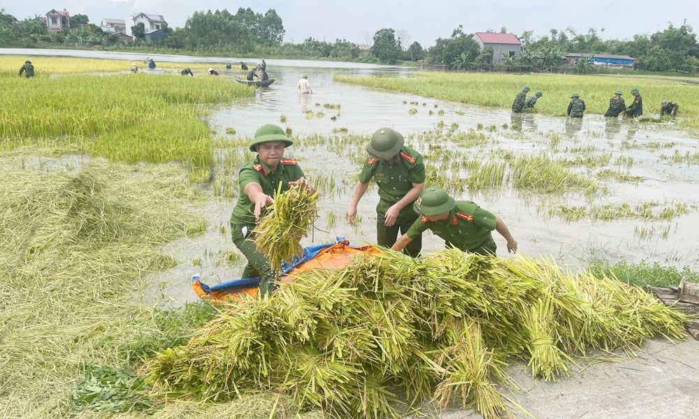 긴급 상황에 직면하여 거의 200명에 달하는 경찰관, 군인, 경찰, 민병대, 그리고 지역 단체 회원들이 주저 없이 현장에 나가 벼 수확을 도왔습니다. 응옥찌 주택단지 책임자인 르엉 티 푸옹 씨는 "이 주택단지에는 127가구가 있는데, 대부분 멀리 떨어진 곳에서 학교나 직장에 다니는 노년층, 중년층, 그리고 젊은 세대입니다. 홍수로 논이 물에 잠길 것이라는 소식을 듣고 사람들은 매우 걱정했습니다. 다행히 구청에서 지원 병력을 동원하여 단 몇 시간 만에 논 전체의 벼 수확이 완료되었습니다."라고 말했습니다.