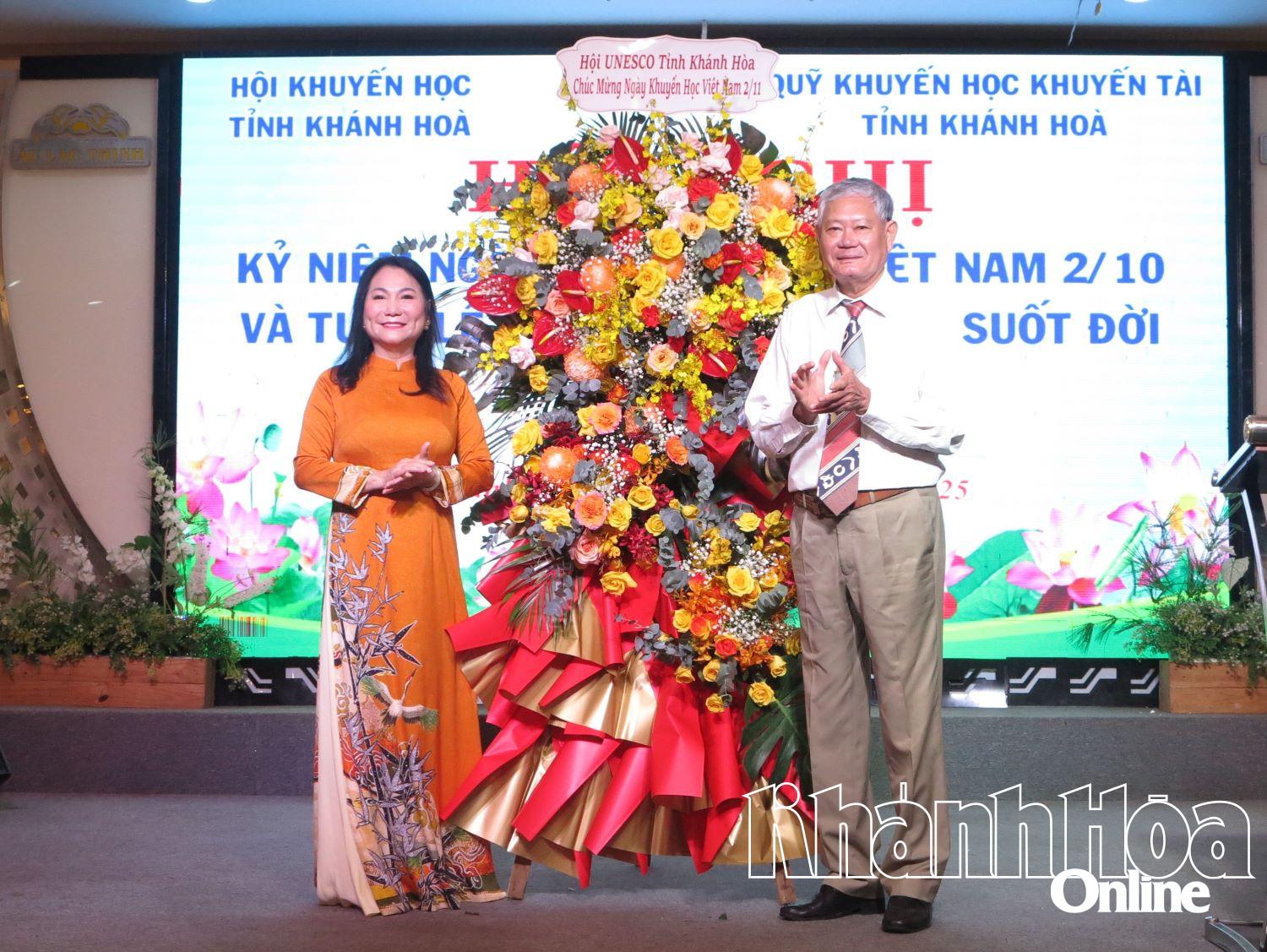 응우옌 티 탄 흐엉(Nguyen Thi Thanh Huong) 여사 - 탐 흐엉 회사 이사이자 칸호아성 유네스코 협회 회장이 교육 진흥을 위한 지방 협회 지도자들에게 꽃을 전달했습니다. |