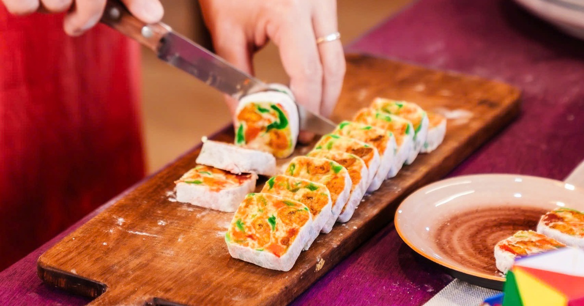 다음 단계는 반죽을 펴서 잼을 넣고 돌돌 말아 치대면서 잼을 안쪽으로 눌러 사각형 모양을 만드는 것입니다. 그 후, 케이크 표면에 밀가루를 발라 매끄럽고 줄무늬가 생기지 않도록 합니다. 케이크가 굳을 때까지 약 한 시간 정도 두었다가 칼로 각 조각을 1cm 두께로 자릅니다. 잼의 색깔이 잘 보이도록 투명한 거울 종이로 감쌉니다. 트라 씨에 따르면, 위에서 언급한 잼을 재료로 선택한 이유는 케이크에 미적인 요소를 더하기 위해서라고 합니다. 케이크를 한 번 자르면 녹색, 빨간색, 노란색, 흰색 등 다채로운 입체 그림처럼 아름다운 케이크 조각이 완성됩니다.