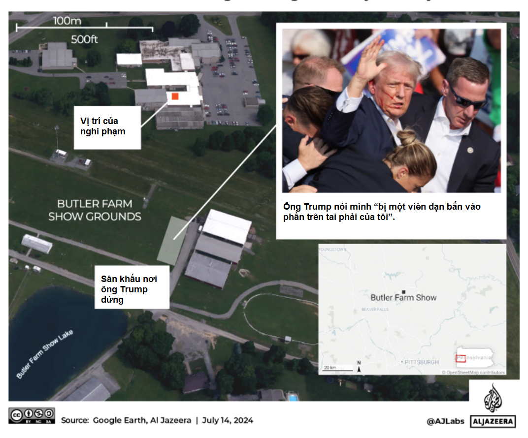 총격 사건은 트럼프 대통령이 피츠버그에서 북쪽으로 약 55km 떨어진 인구 13,000명의 도시인 버틀러에서 열리는 버틀러 농장 쇼에서 대규모 야외 집회를 열고 있을 때 발생했습니다.