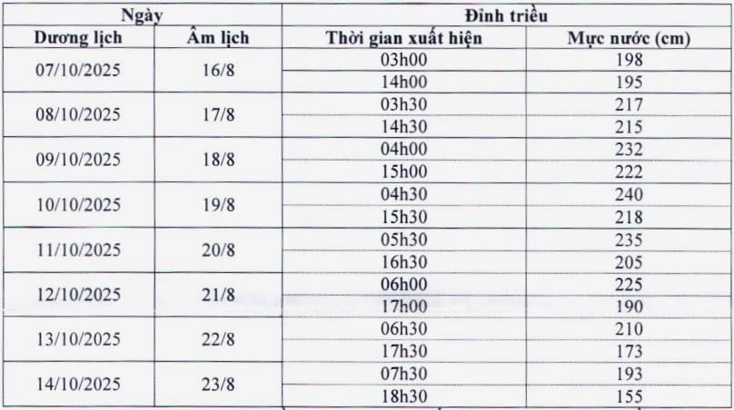 성 수문기상관측소에 따르면, 2025년 10월 동해안 지역은 두 차례 만조를 경험할 수 있으며, 그중 10월 8일부터 12일(음력 8월 15일) 사이에 발생하는 만조는 매우 강할 것으로 예상됩니다. 간하오(Ganh Hao) 관측소의 최고 수위는 경보 수준 III를 약 20cm 초과할 수 있으며, 강풍과 큰 파도, 그리고 폭우 위험이 동시에 발생할 수 있습니다. 이로 인해 저지대 침수, 강둑 및 하구 산사태가 발생하여 생산 및 주민 생활에 큰 영향을 미칠 수 있습니다.