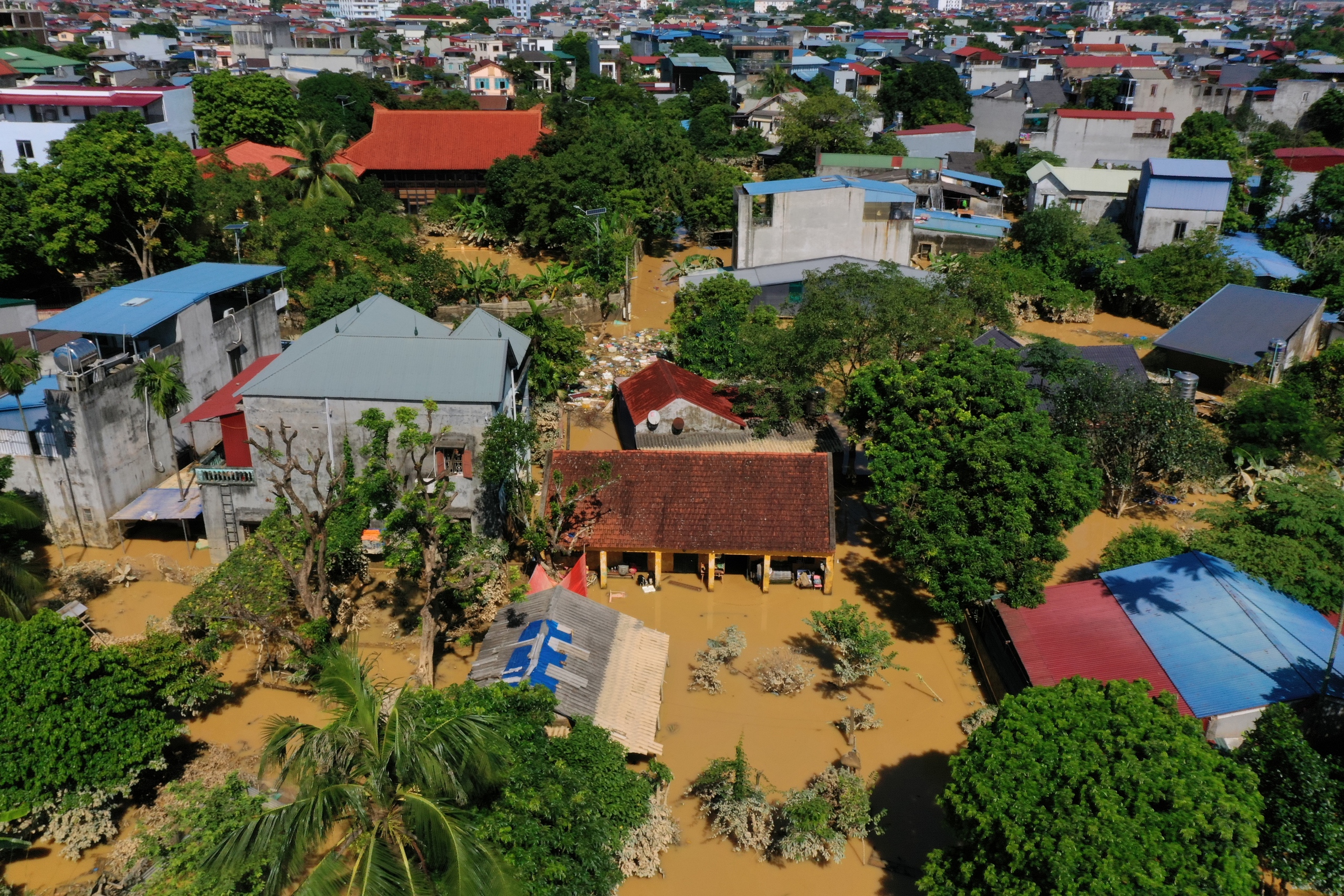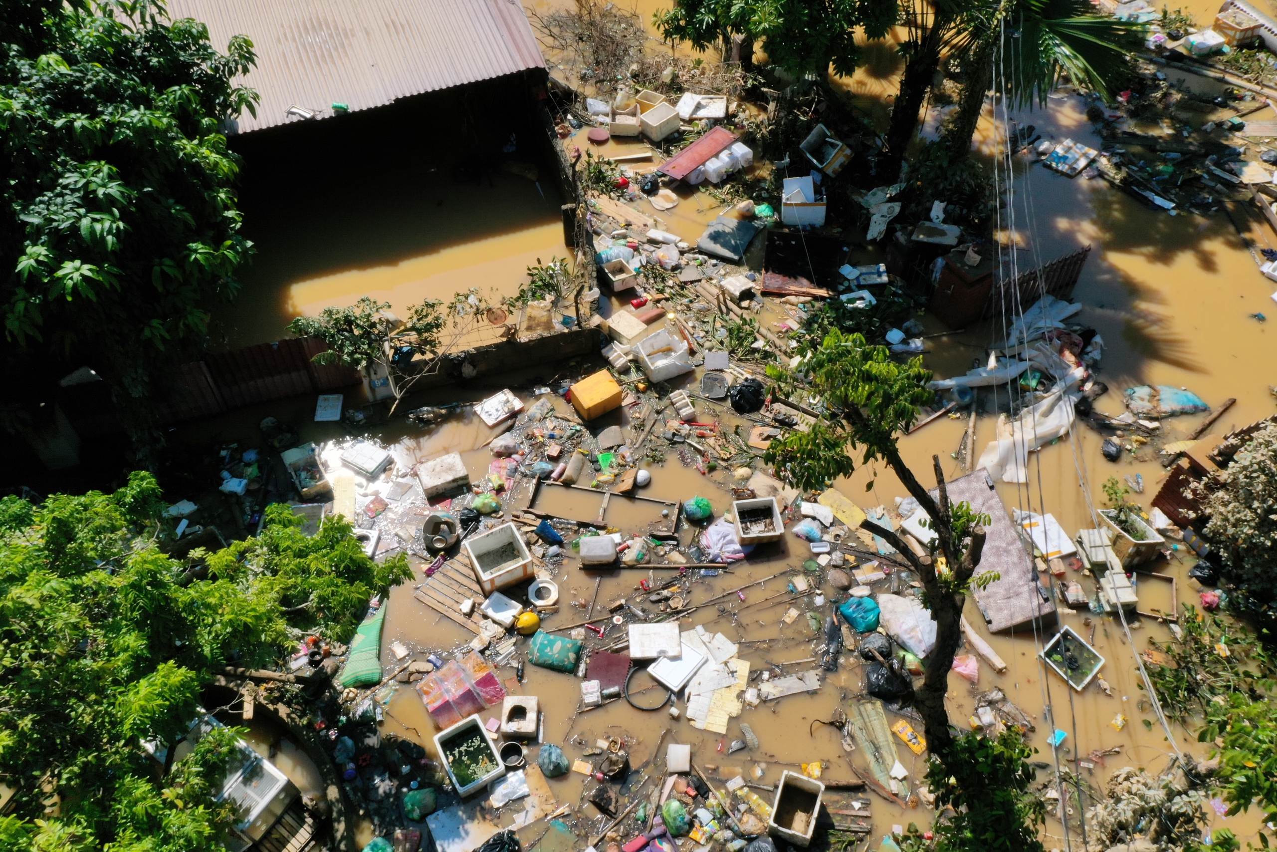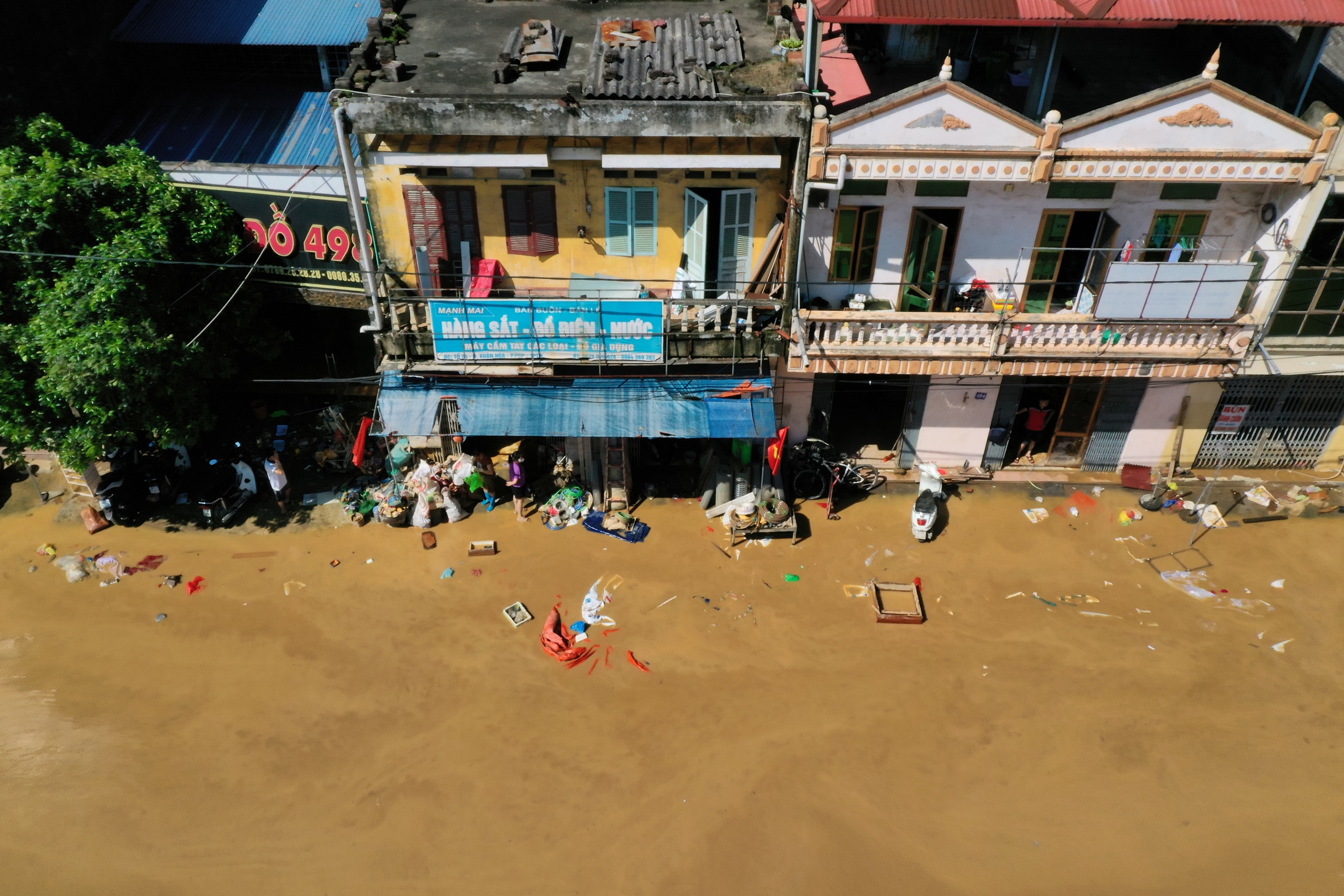 Nước dâng cao đến mái nhà, tán cây. Khi nước rút xuống để lại "dấu tích" là lớp bùn màu vàng
