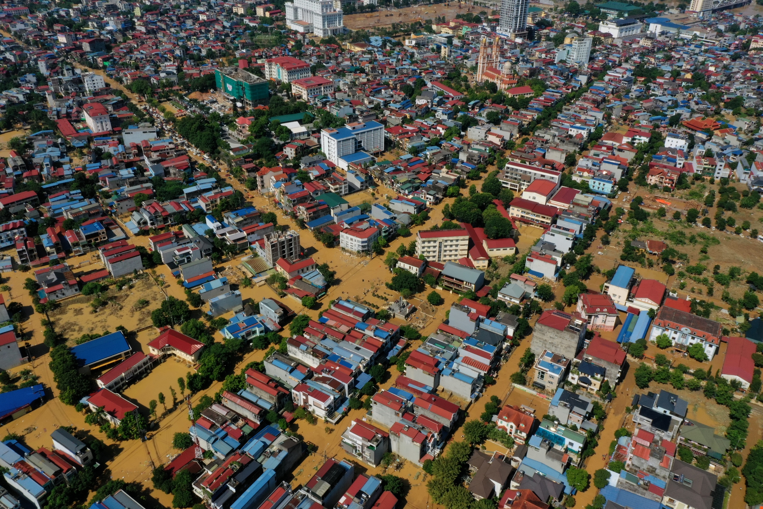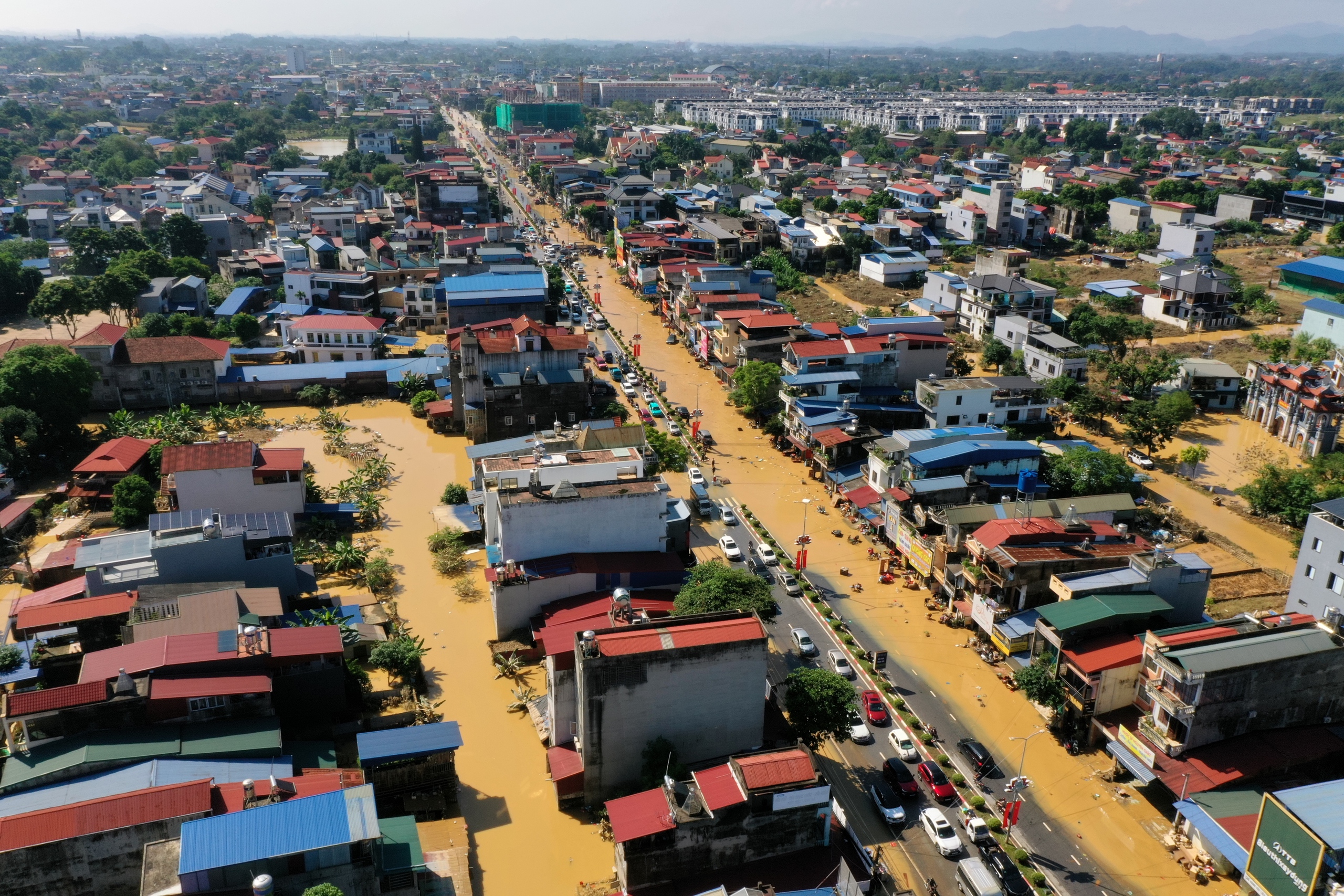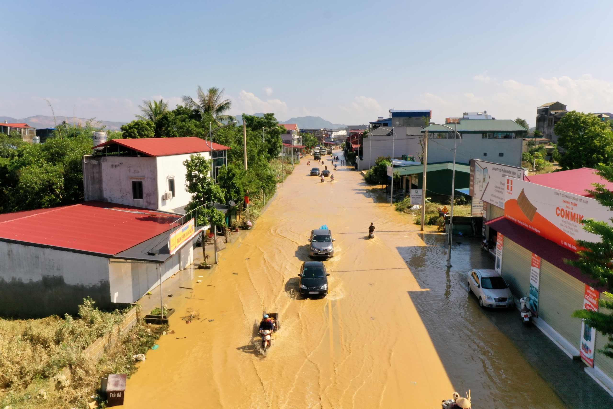 Nước dâng cao đến mái nhà, tán cây. Khi nước rút xuống để lại "dấu tích" là lớp bùn màu vàng