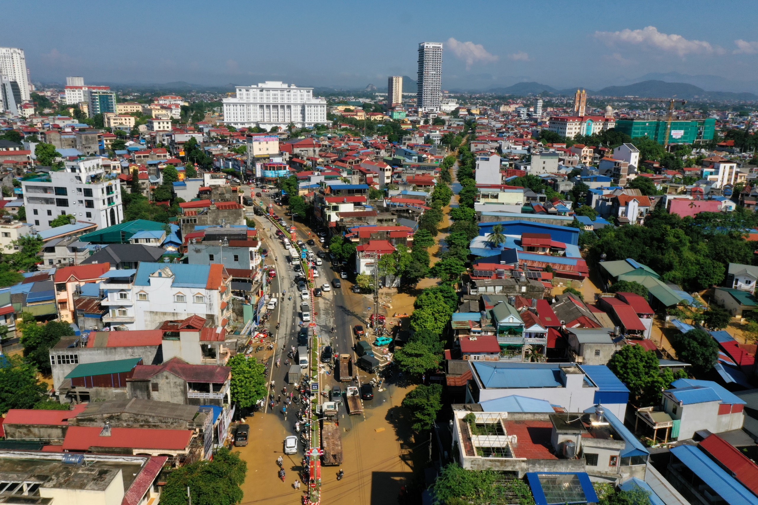 Ngày 9.10, khu vực trung tâm tỉnh Thái Nguyên trời nắng to, nước lũ đang rút dần. Trên một số tuyến đường, xe cộ đã có thể di chuyển. Lũ rút nhưng để lại lớp bùn non dày đặc bám trên mặt đường, tường nhà người dân. Một số nơi ngổn ngang rác thải, người dân bắt đầu việc dọn dẹp, khắc phục hậu quả sau lũ.