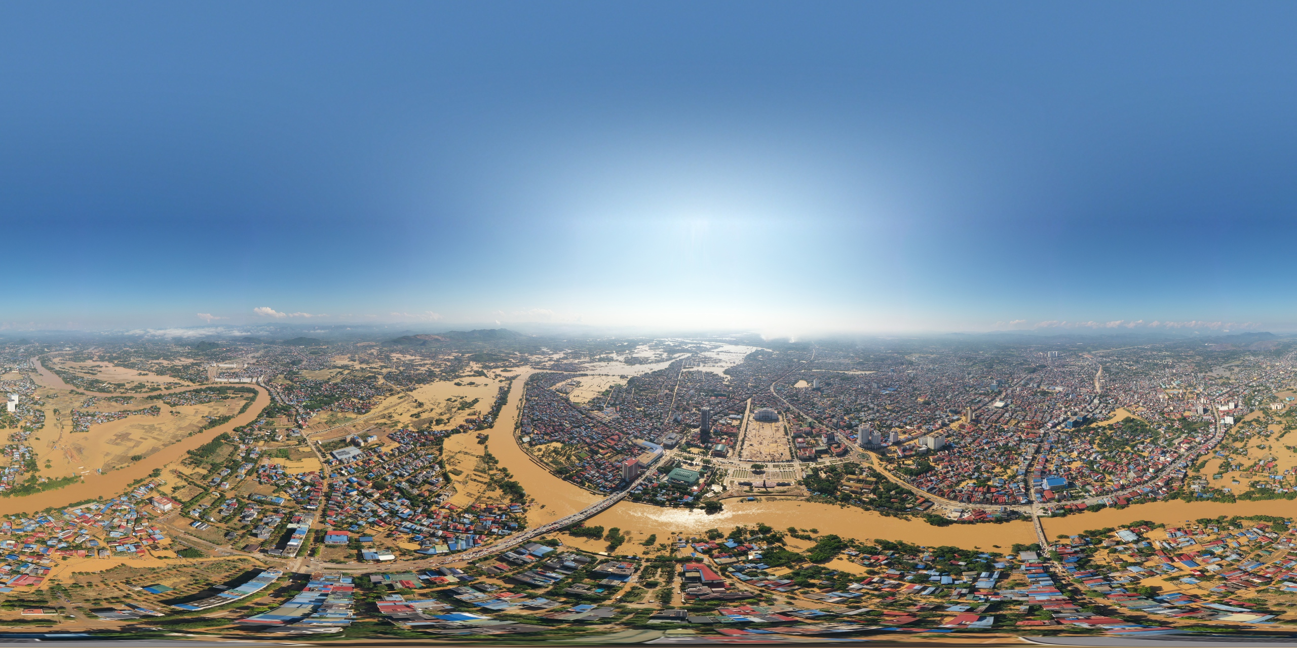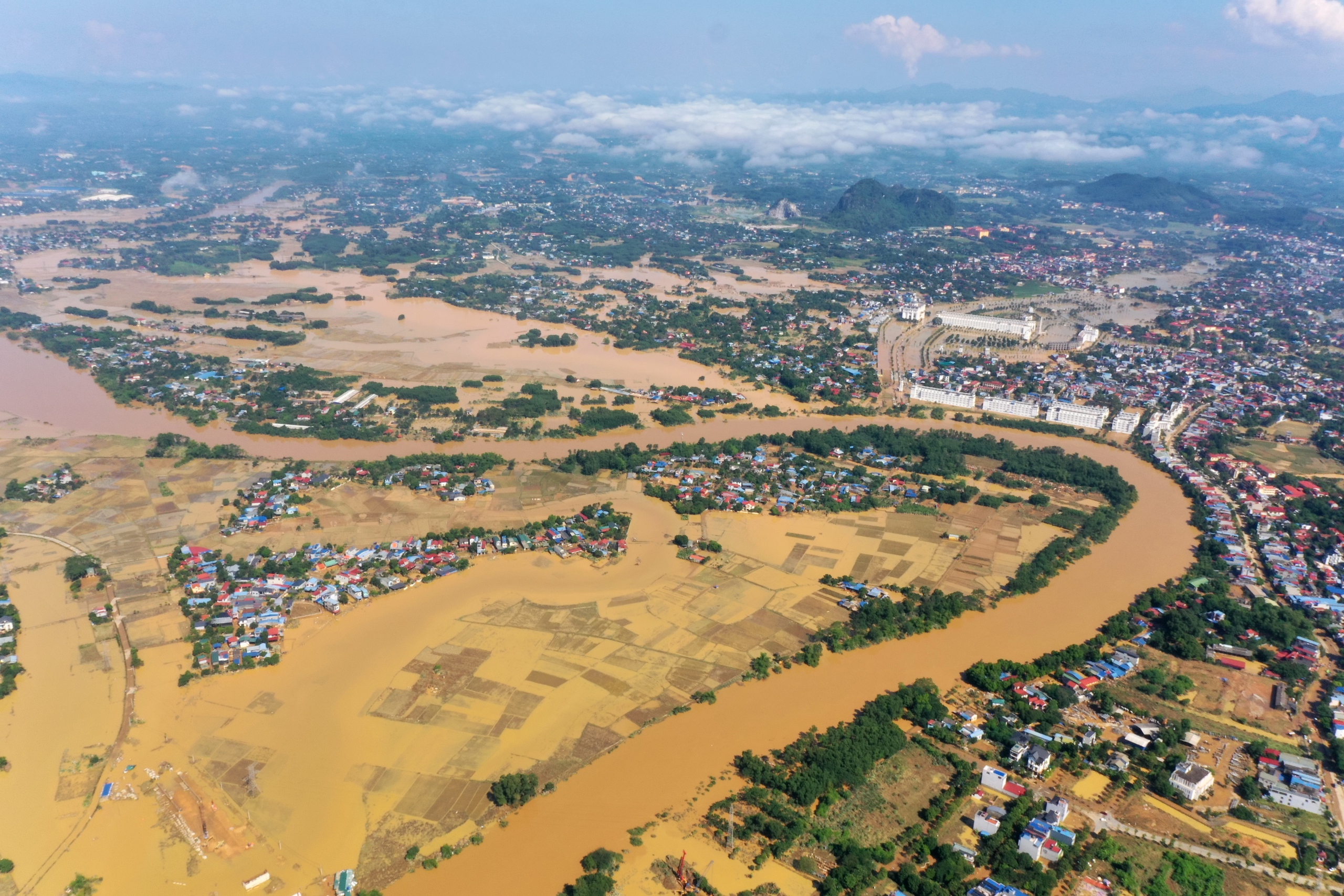 Anh Lê Duy Khắc (38 tuổi) làm nghề chụp ảnh, quay phim đã dùng flycam ghi lại nhiều khoảnh khắc vùng lũ Thái Nguyên từ trên cao hôm nay 9.10. Anh Khắc cho biết đây là trận lũ lịch sử, nước dâng cao ảnh hưởng đến nhiều người dân, việc khắc phục hậu quả cũng sẽ rất vất vả, tốn nhiều thời gian.