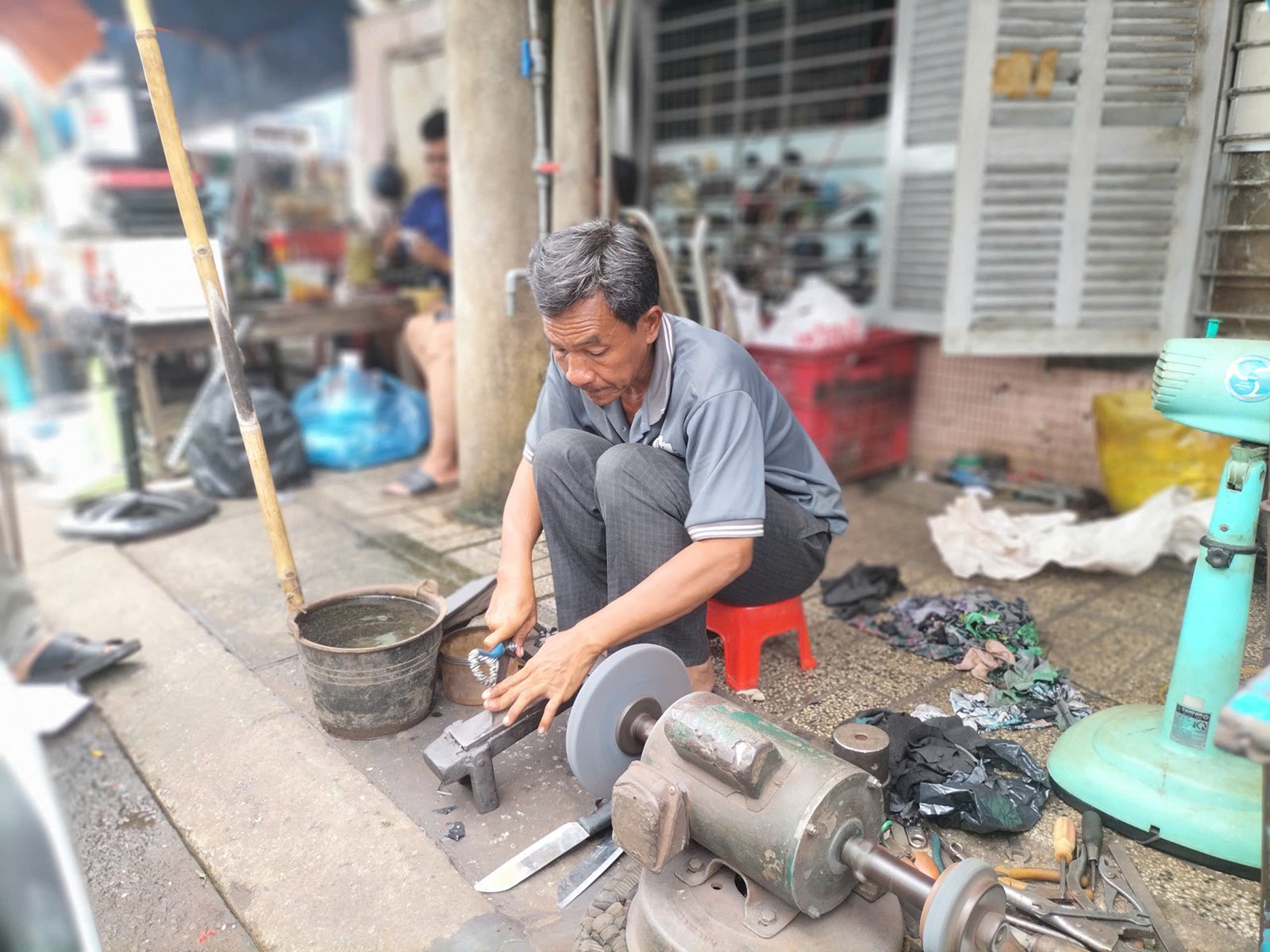 Cũng như bao nghề khác, sáng sớm người thợ cũng tất bật dọn lỉnh kỉnh các dụng cụ hành nghề, chủ yếu là đá mài các loại, búa, đe, giũa… Cái đắt giá nhất là chiếc mô tơ điện có gắn đá mài, giúp cho công việc đỡ vất vả và tiết kiệm thời gian. Ghé lại tiệm ông Bảy, phường Long Xuyên tôi gửi mài chiếc kìm cắt móng tay, dụng cụ nhỏ, mài chẳng bao nhiêu tiền nhưng ông rất ân cần, vui vẻ nhận, hẹn một chút lại lấy.