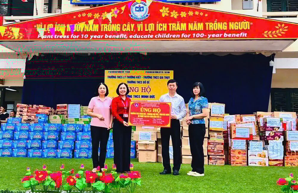 Đại diện các trường học trên địa bàn phường Bồ Đề trao quà hỗ trợ cho Trường Trung học cơ sở Minh Đức. |