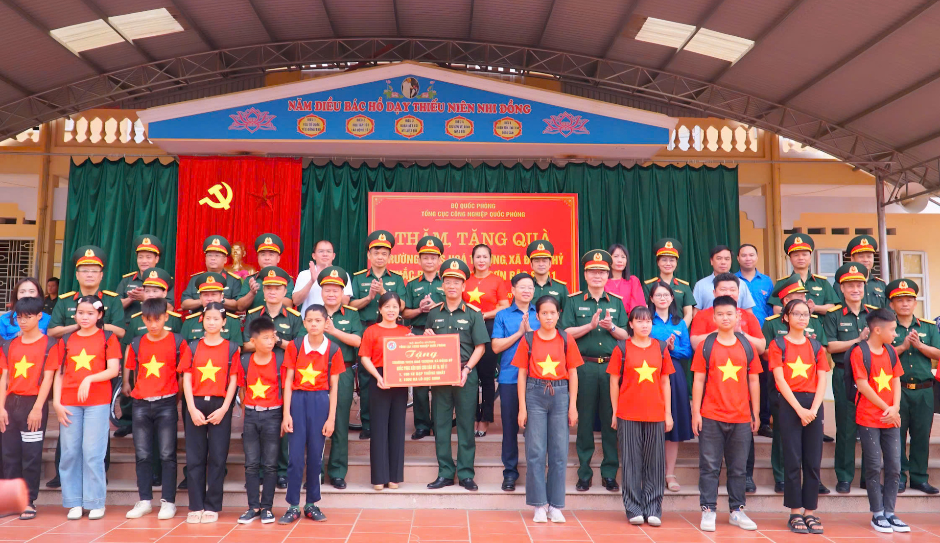 Trung tướng Đinh Quốc Hùng trao quà tặng học sinh Trường THCS Hóa Thượng.