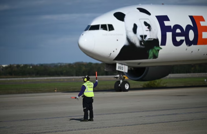 Một máy bay chở hàng do FedEx vận hành đang vận chuyển 2 chú gấu trúc khổng lồ, hạ cánh xuống sân bay Dulles ở Virginia, ngày 15/10/2024. Ảnh: Getty Images