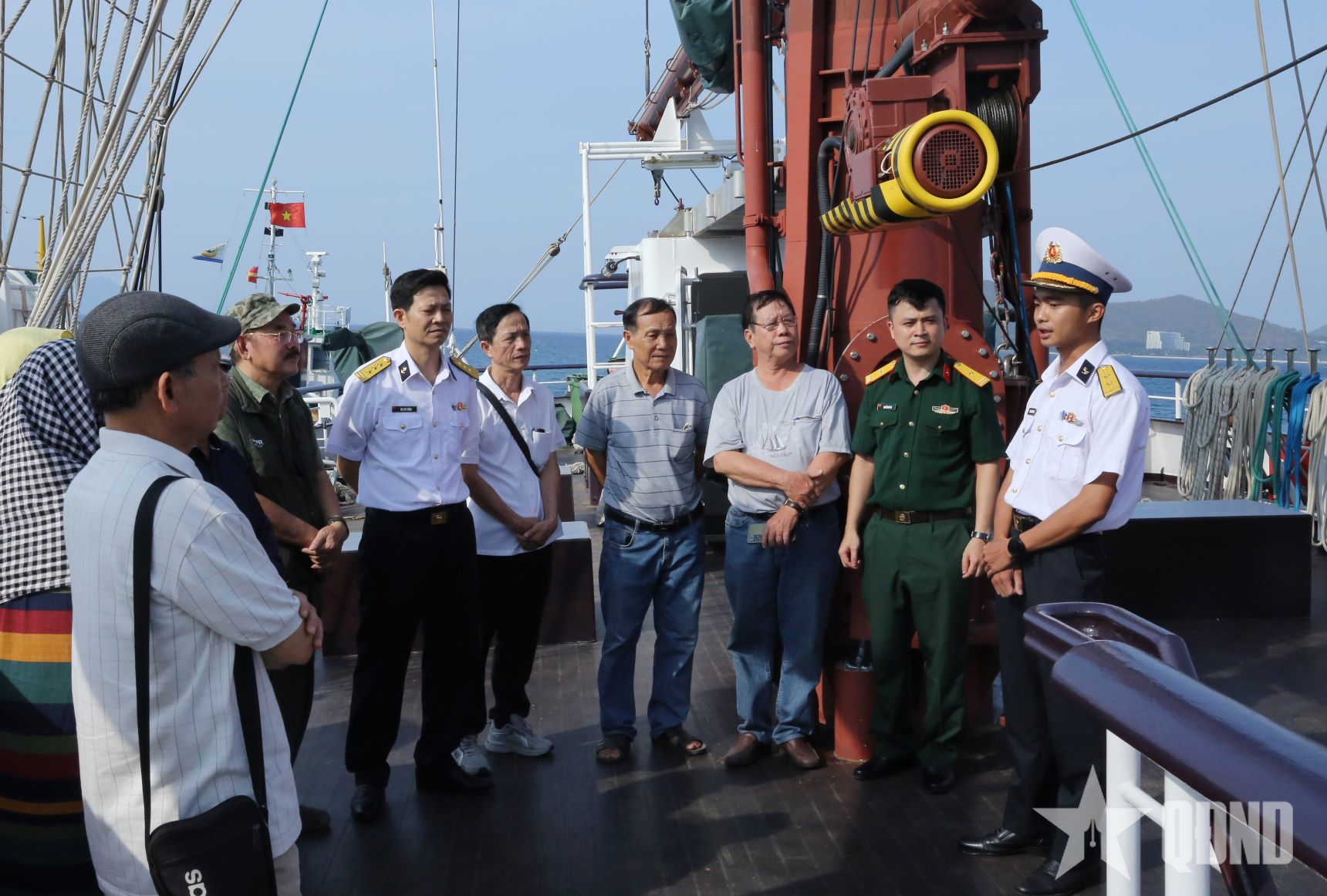 Tác giả (thứ hai, từ phải sang) cùng các nhà văn tham quan, tìm hiểu tại Tàu buồm 286-Lê Quý Đôn, tháng 8-2025. Ảnh: PHƯƠNG NGUYÊN |
