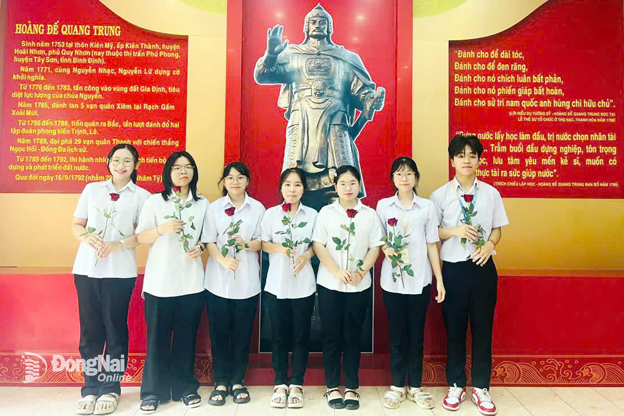 Em Vũ Thị Thùy Dương (giữa) cùng các thành viên trong đội tuyển Địa lý trước kỳ thi học sinh giỏi Quốc gia năm học 2024-2025. Ảnh: Thu Hà |